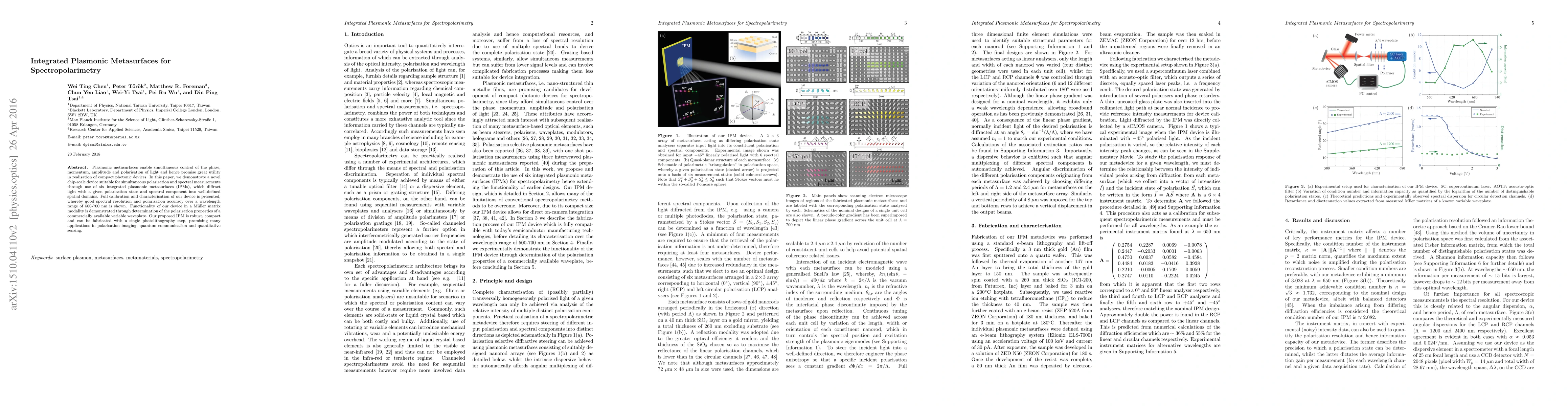 This paper presents a chip-scale device using six integrated plasmonic metasurfaces for simultaneous polarisation and spectral measurements, demonstrating good resolution and accuracy over a 500-700 nm range, with potential applications in polarisation imaging, quantum communication, and sensing. The device is compact and can be fabricated with a single photolithography step.