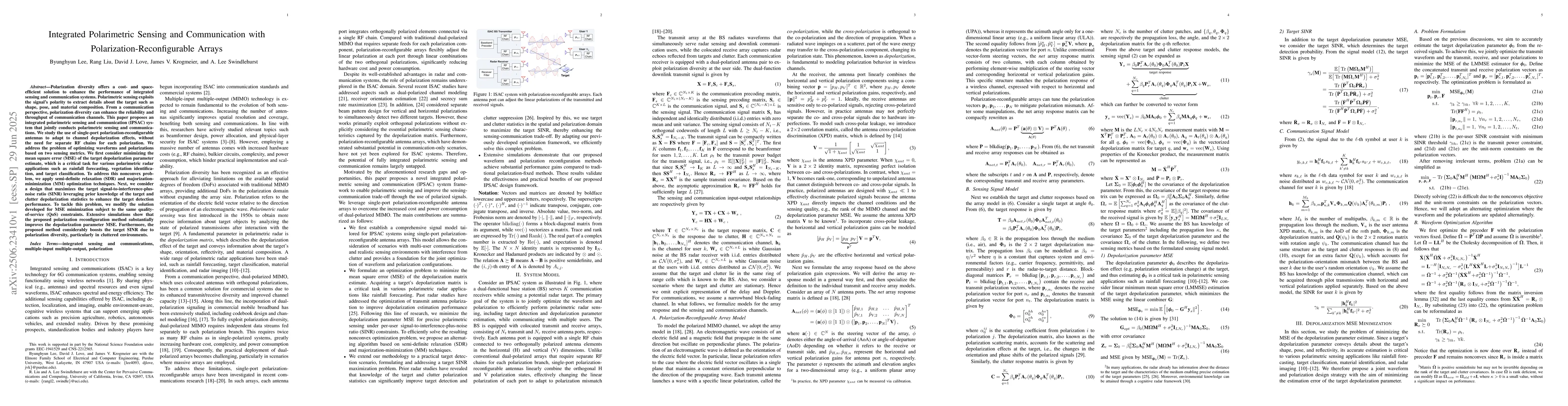 This paper proposes an integrated system for polarimetric sensing and communication using single-port polarization-reconfigurable antennas. It optimizes waveforms and polarizations to minimize mean square error (MSE) for tasks like rainfall forecasting and target classification, and to maximize signal-to-interference-plus-noise ratio (SINR) for enhanced target detection. Simulations demonstrate significant improvements in depolarization parameter MSE and target SINR, particularly in cluttered environments.