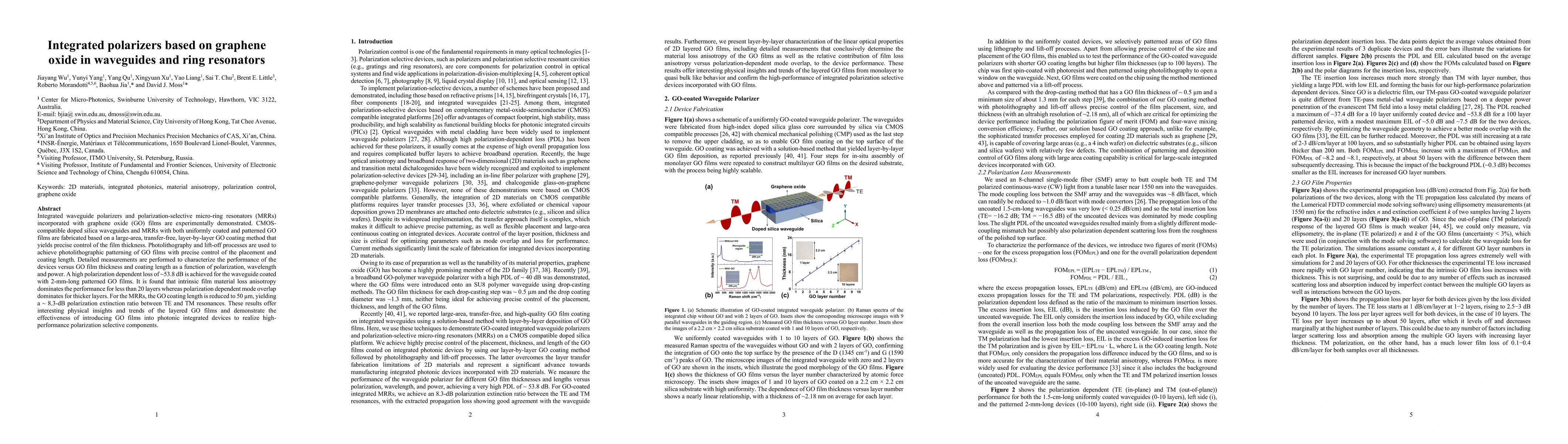 This research demonstrates integrated waveguide polarizers and polarization-selective micro-ring resonators using graphene oxide films, achieving high polarization dependent loss and demonstrating effective control over device performance via layer-by-layer GO coating.