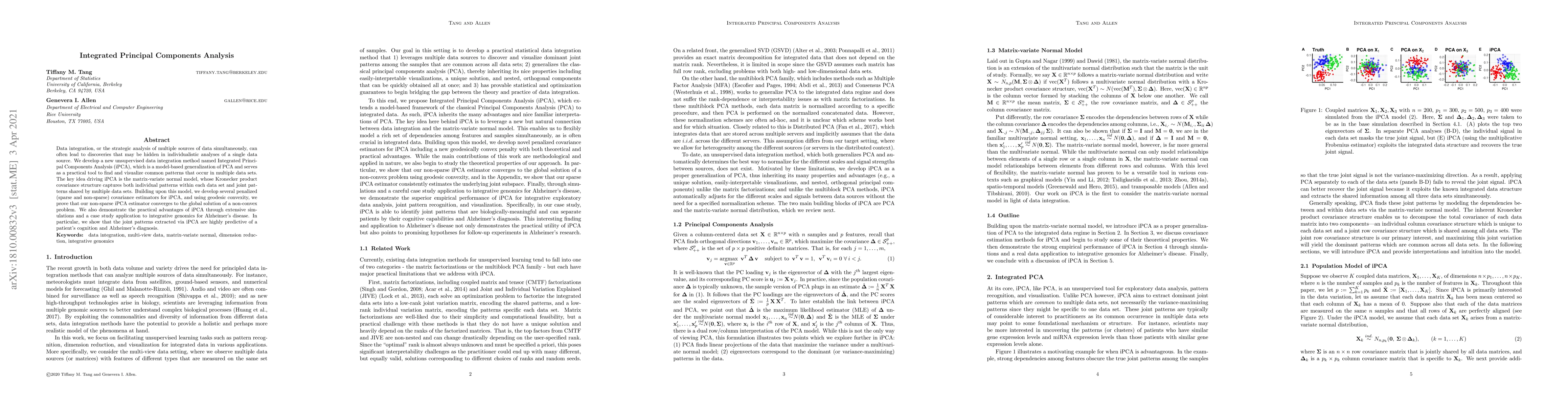 Data integration, or the strategic analysis of multiple sources of data simultaneously, can often lead to discoveries that may be hidden in individualistic analyses of a single data source. We develop a new unsupervised data integration method named Integrated Principal Components Analysis (iPCA), which is a model-based generalization of PCA and serves as a practical tool to find and visualize common patterns that occur in multiple data sets. The key idea driving iPCA is the matrix-variate normal model, whose Kronecker product covariance structure captures both individual patterns within each data set and joint patterns shared by multiple data sets. Building upon this model, we develop several penalized (sparse and non-sparse) covariance estimators for iPCA, and using geodesic convexity, we prove that our non-sparse iPCA estimator converges to the global solution of a non-convex problem. We also demonstrate the practical advantages of iPCA through extensive simulations and a case study application to integrative genomics for Alzheimer's disease. In particular, we show that the joint patterns extracted via iPCA are highly predictive of a patient's cognition and Alzheimer's diagnosis.