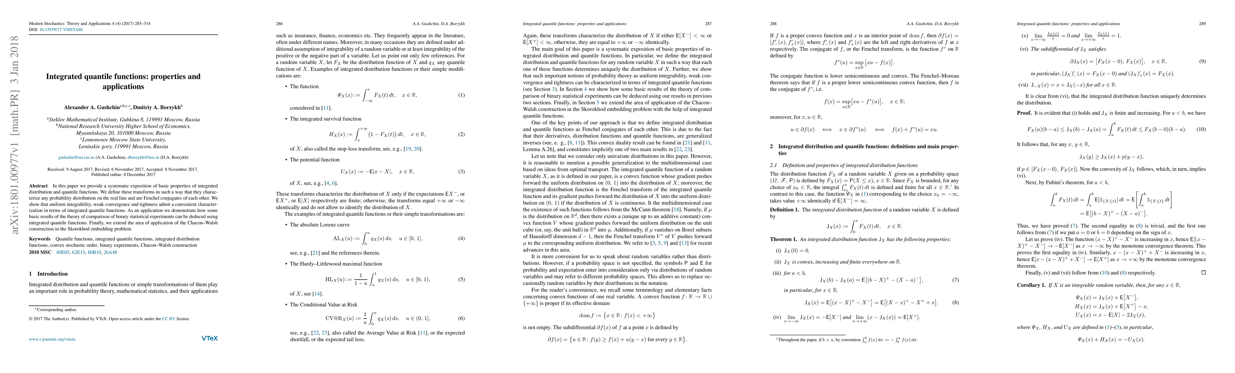 This paper systematically explores integrated distribution and quantile functions, showing they characterize any probability distribution and are Fenchel conjugates. It applies these functions to characterize uniform integrability and weak convergence, and demonstrates their utility in comparing binary statistical experiments and extending the Chacon-Walsh construction in the Skorokhod embedding problem.