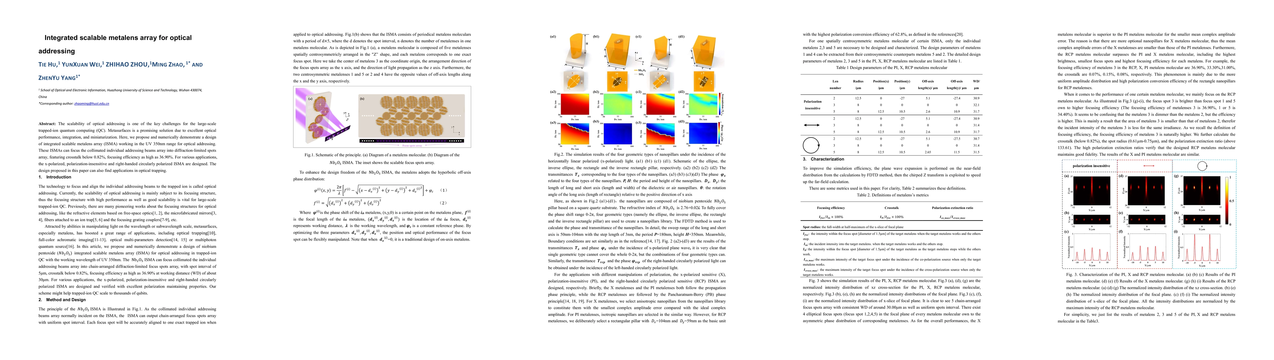 This paper proposes an integrated scalable metalens array (ISMA) for optical addressing in UV range, achieving high focusing efficiency and low crosstalk. The design supports various polarization states and has potential applications in large-scale quantum computing and optical trapping.