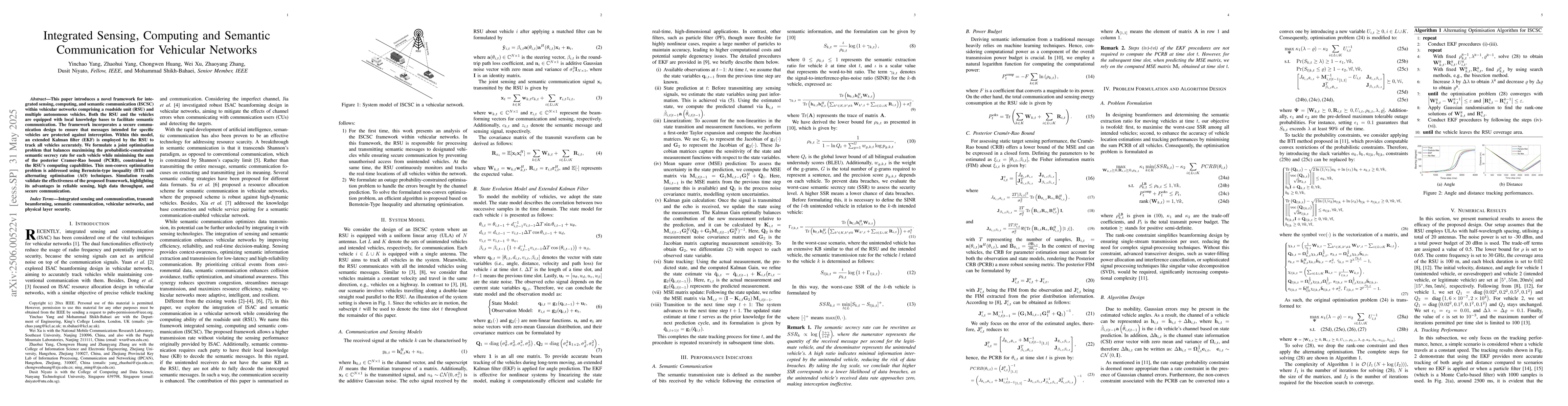 The research proposes an Integrated Sensing, Computing, and Semantic Communication (ISCSC) framework for vehicular networks, involving a roadside unit (RSU) and multiple autonomous vehicles. It uses local knowledge bases for semantic communication, an Extended Kalman Filter (EKF) for vehicle tracking, and Bernstein-type inequality (BTI) along with alternating optimization (AO) to solve a joint optimization problem.