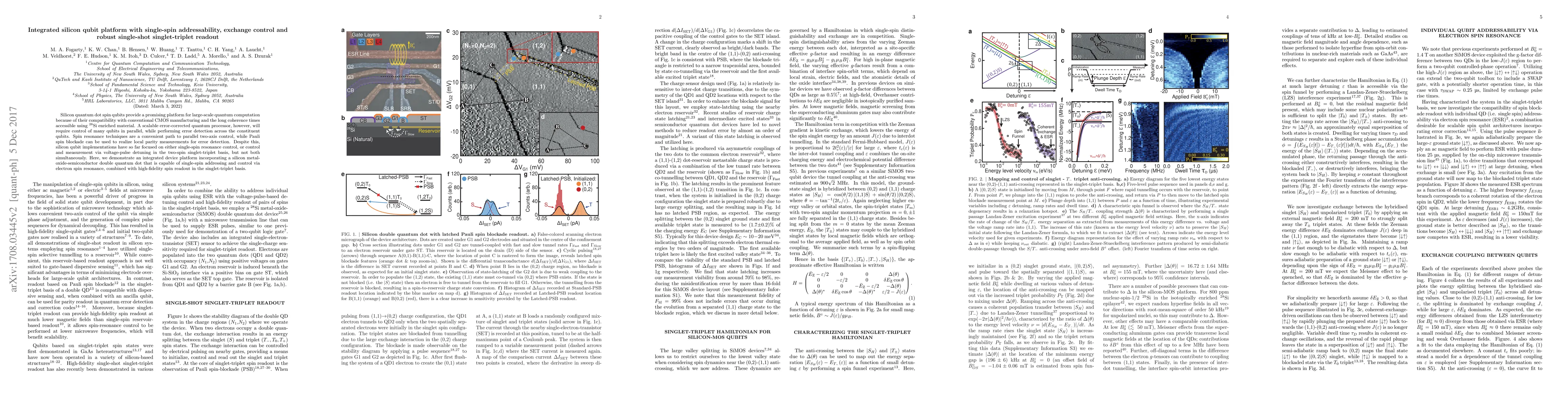 This paper presents an integrated silicon qubit platform featuring single-spin addressability and control through electron spin resonance, alongside robust single-shot readout in the singlet-triplet basis. The device combines scalable two-axis control and high-fidelity error detection, essential for large-scale quantum computing.