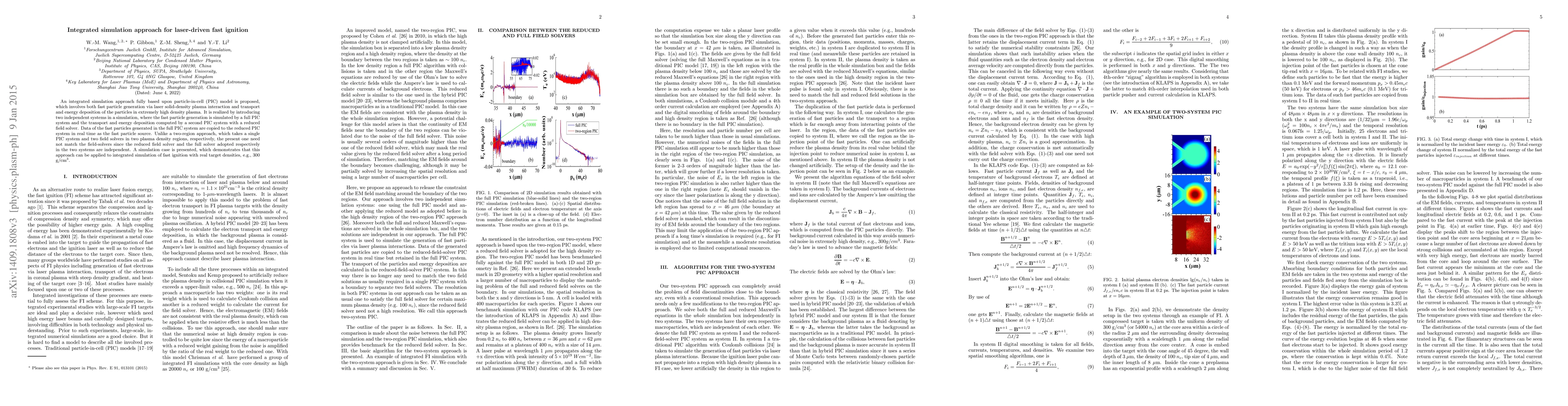 This paper proposes an integrated simulation approach using particle-in-cell (PIC) models for laser-driven fast ignition, involving separate systems for fast particle generation and transport, with real-time data transfer between them. Unlike traditional two-region approaches, this method uses independent PIC systems with different field solvers, simplifying the matching process.