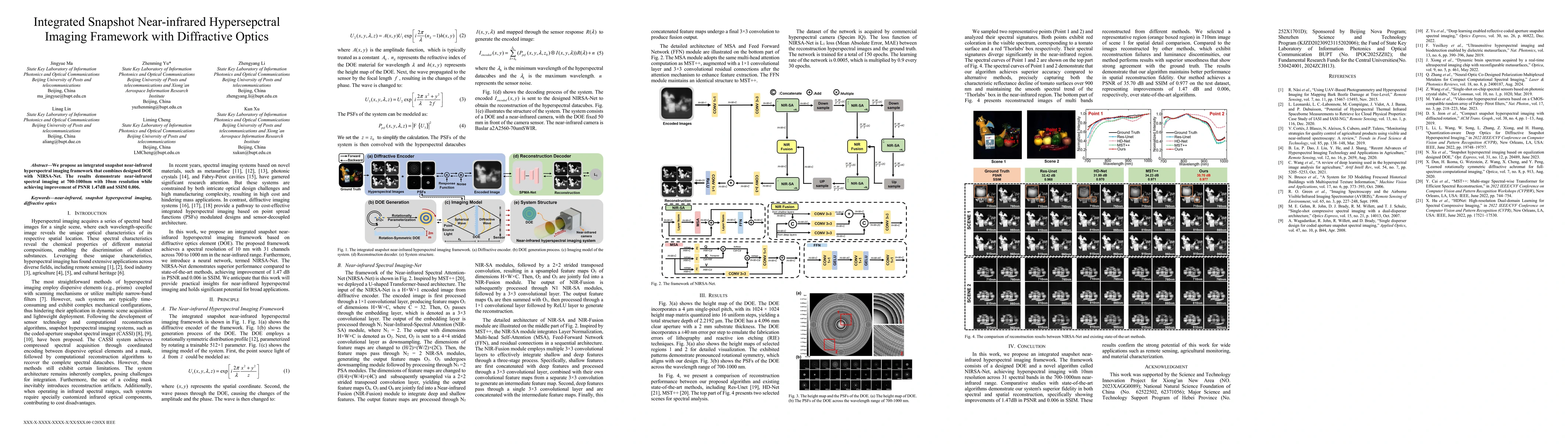 The research proposes an integrated snapshot near-infrared hyperspectral imaging framework combining a designed Diffractive Optical Element (DOE) with NIRSA-Net, achieving spectral imaging from 700-1000nm with 10nm resolution.