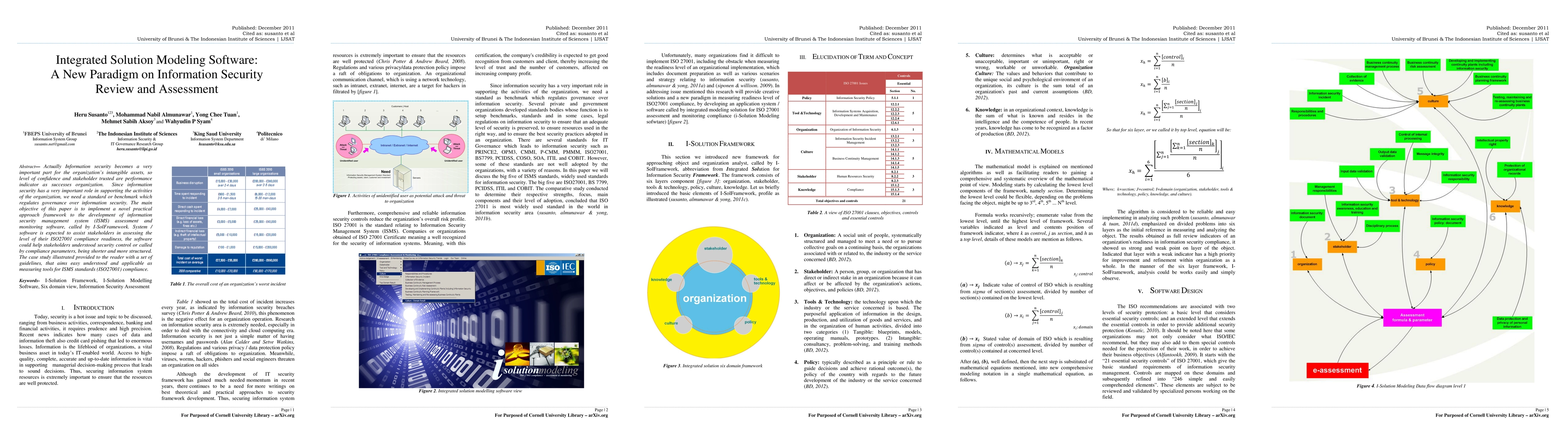 A new software framework called I-SolFramework is proposed to help organizations assess their ISO27001 compliance readiness and understand security controls. The framework aims to provide a practical approach for developing information security management system assessment and monitoring software.
