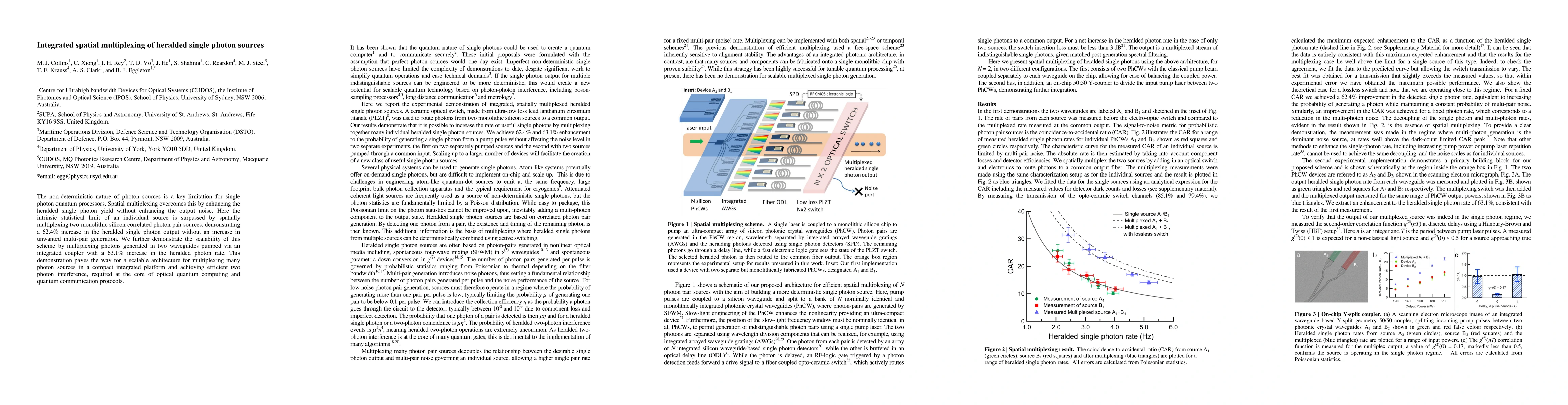 This paper presents a method to enhance the yield of heralded single photon sources through spatial multiplexing, achieving a 62.4% increase in output without unwanted noise, and scales this technique to demonstrate a 63.1% increase by multiplexing two photon sources. This advancement facilitates scalable integration for quantum computing and communication.