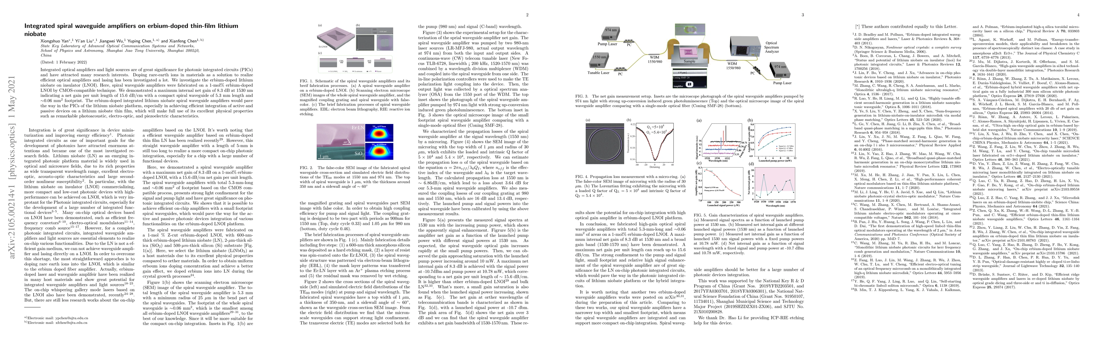 This research paper details the fabrication of compact integrated spiral waveguide amplifiers using 1-mol% erbium-doped lithium niobate on insulator (LNOI) via CMOS-compatible techniques, achieving a net gain of 8.3 dB at 1530 nm, highlighting the potential for efficient integration in photonic integrated circuits (PICs).