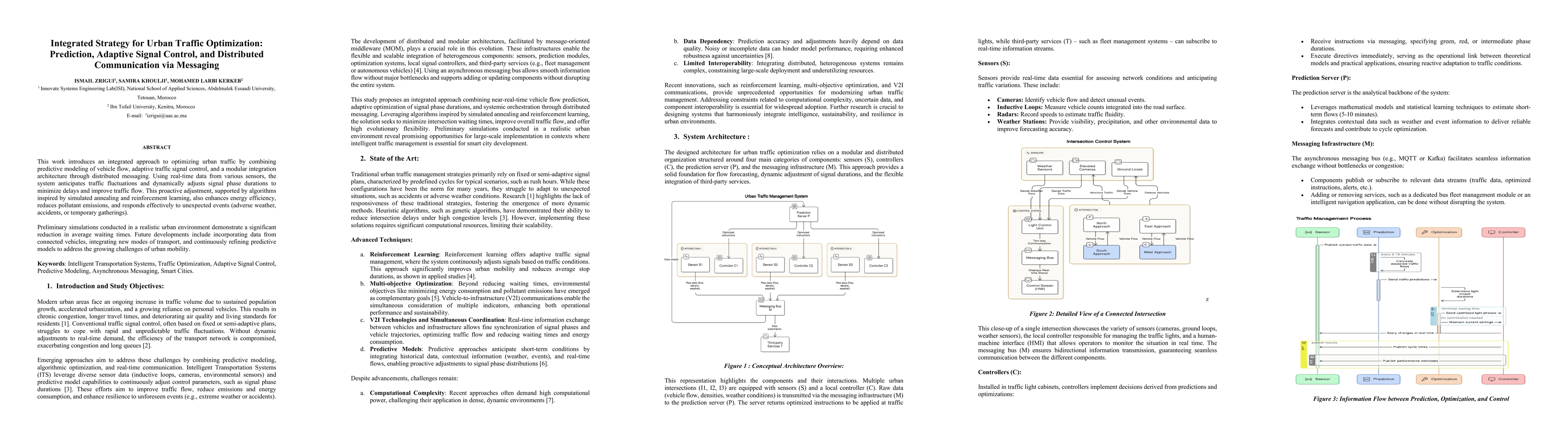 This paper proposes an integrated urban traffic optimization strategy that leverages predictive modeling, adaptive signal control, and distributed communication. The system dynamically adjusts traffic signals based on real-time data to minimize delays and enhance efficiency, showing significant reductions in waiting times in preliminary simulations.