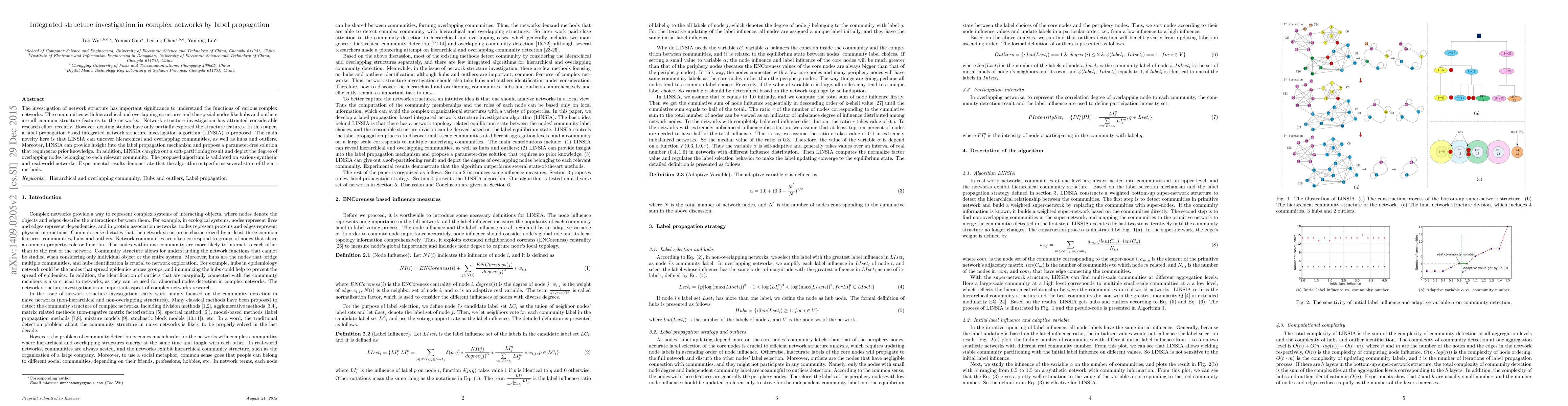 The paper proposes LINSIA, a label propagation algorithm for investigating complex network structures, which uncovers hierarchical and overlapping communities, hubs, and outliers without requiring prior knowledge. The algorithm provides a soft-partitioning result and outperforms existing methods, as demonstrated on synthetic and real-world networks.