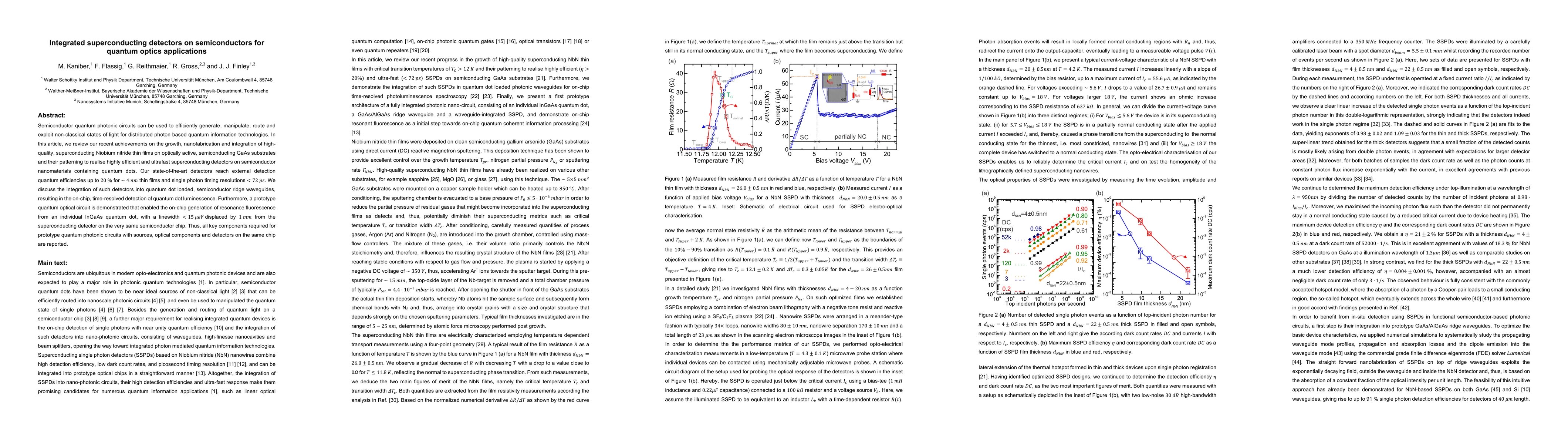 Semiconductor quantum photonic circuits can be used to efficiently generate, manipulate, route and exploit non-classical states of light for distributed photon based quantum information technologies. In this article, we review our recent achievements on the growth, nanofabrication and integration of high-quality, superconducting niobium nitride thin films on optically active, semiconducting GaAs substrates and their patterning to realise highly efficient and ultrafast superconducting detectors on semiconductor nanomaterials containing quantum dots. Our state-of-the-art detectors reach external detection quantum efficiencies up to 20% for ~4nm thin films and single photon timing resolutions <72ps. We discuss the integration of such detectors into quantum dot loaded, semiconductor ridge waveguides, resulting in the on-chip, time-resolved detection of quantum dot luminescence. Furthermore, a prototype quantum optical circuit is demonstrated that enabled the on-chip generation of resonance fluorescence from an individual InGaAs quantum dot, with a line width <15 $\mu$eV displaced by 1mm from the superconducting detector on the very same semiconductor chip. Thus, all key components required for prototype quantum photonic circuits with sources, optical components and detectors on the same chip are reported.