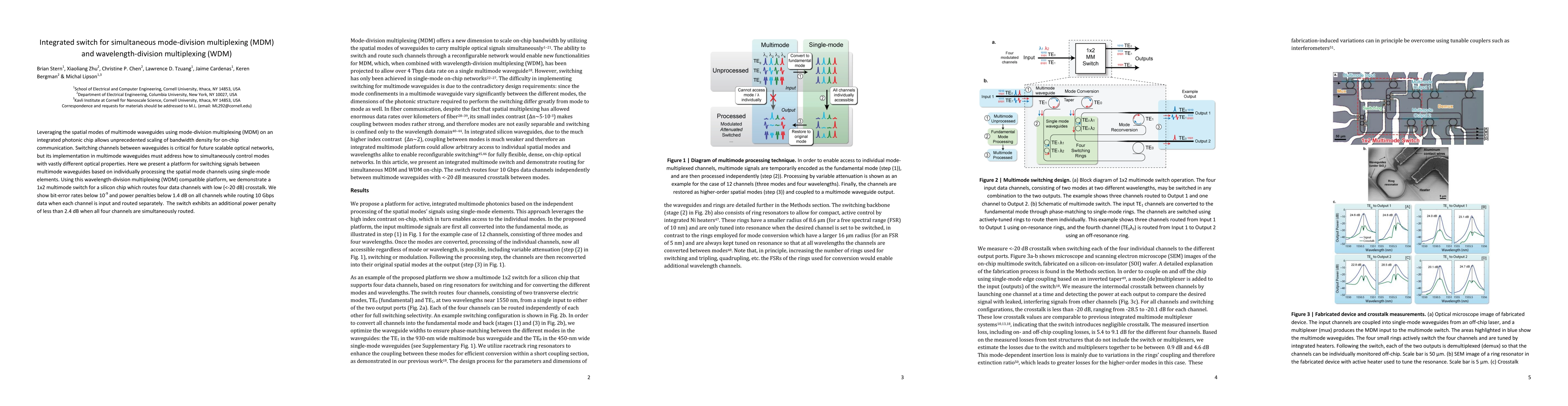 This paper presents an integrated photonic switch for simultaneous mode-division multiplexing (MDM) and wavelength-division multiplexing (WDM) on a silicon chip, demonstrating low crosstalk and high-speed data routing for future scalable optical networks. The switch routes four 10 Gbps data channels with minimal power penalties and bit-error rates.