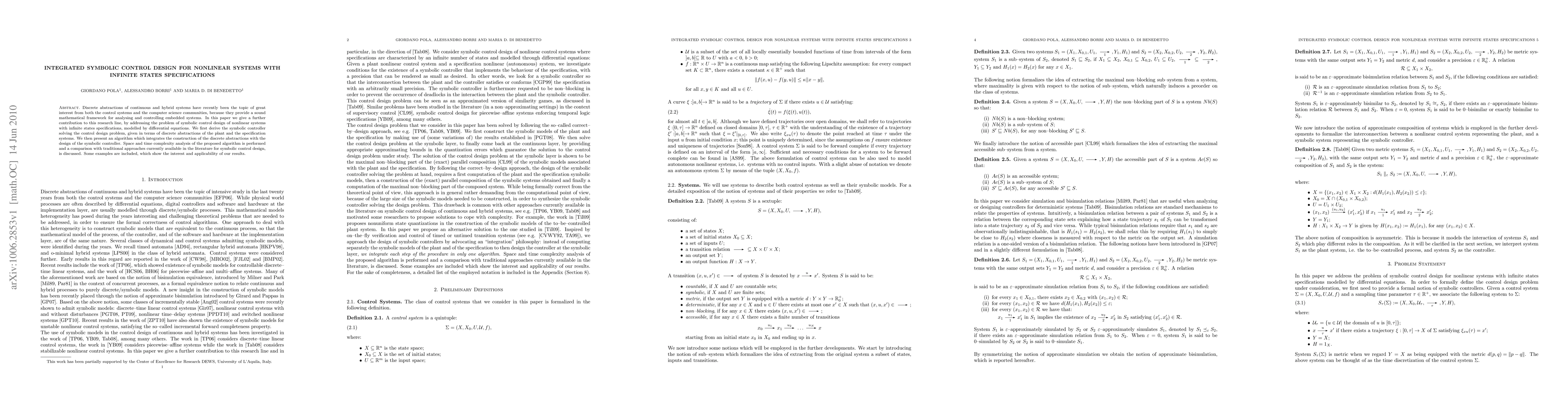 This paper proposes a novel symbolic control design method for nonlinear systems with infinite state specifications, modeled by differential equations. It integrates the construction of discrete abstractions with the design of a symbolic controller, and includes a complexity analysis and comparison with existing methods.