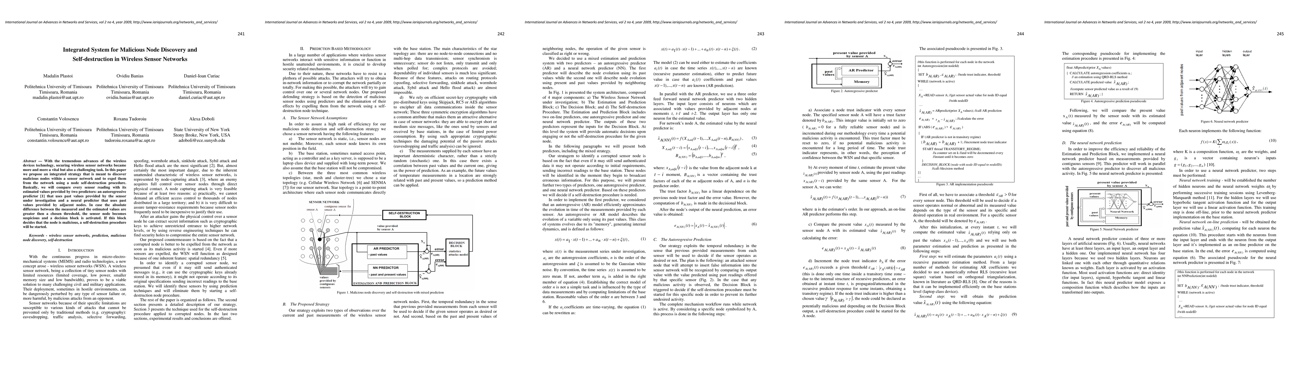 This paper proposes an integrated system for detecting and expelling malicious nodes in wireless sensor networks by comparing sensor readings with predicted values from autoregressive and neural predictors. Malicious nodes are identified and then subjected to a self-destruction procedure if they deviate significantly from expected values.