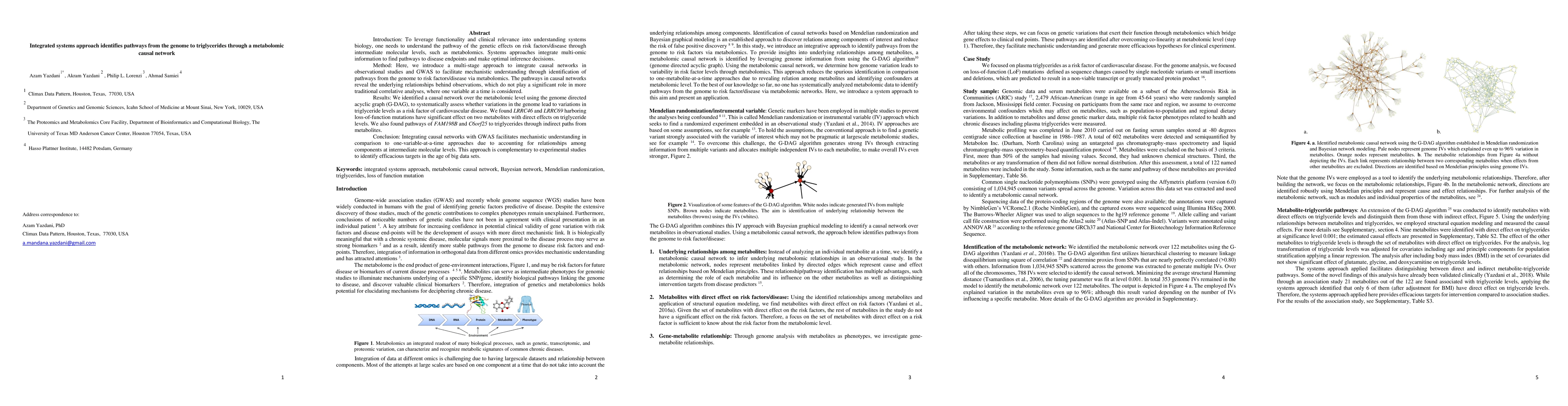 This study employs an integrated systems approach to identify causal pathways from genetic variations to triglyceride levels via metabolomics, revealing significant effects of LRRC46, LRRC69, FAM198B, and C6orf25 mutations. The multi-stage causal network analysis highlights the importance of considering relationships among molecular components for better mechanistic understanding compared to traditional correlative analyses.