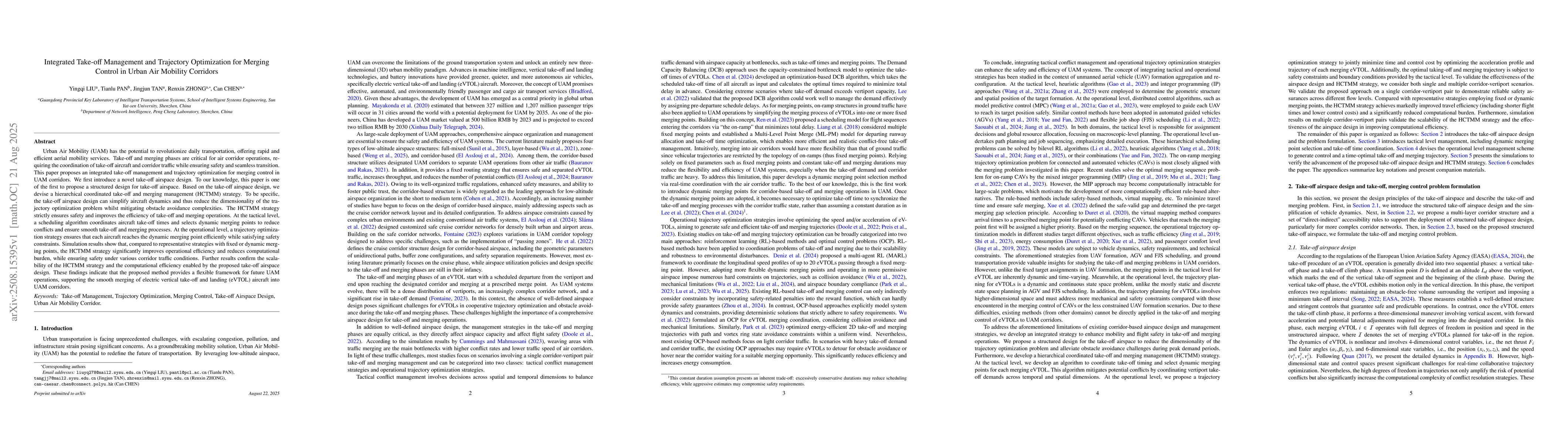 Urban Air Mobility (UAM) has the potential to revolutionize daily transportation, offering rapid and efficient aerial mobility services. Take-off and merging phases are critical for air corridor operations, requiring the coordination of take-off aircraft and corridor traffic while ensuring safety and seamless transition. This paper proposes an integrated take-off management and trajectory optimization for merging control in UAM corridors. We first introduce a novel take-off airspace design. To our knowledge, this paper is one of the first to propose a structured design for take-off airspace. Based on the take-off airspace design, we devise a hierarchical coordinated take-off and merging management (HCTMM) strategy. To be specific, the take-off airspace design can simplify aircraft dynamics and thus reduce the dimensionality of the trajectory optimization problem whilst mitigating obstacle avoidance complexities. The HCTMM strategy strictly ensures safety and improves the efficiency of take-off and merging operations. At the tactical level, a scheduling algorithm coordinates aircraft take-off times and selects dynamic merging points to reduce conflicts and ensure smooth take-off and merging processes. At the operational level, a trajectory optimization strategy ensures that each aircraft reaches the dynamic merging point efficiently while satisfying safety constraints. Simulation results show that, compared to representative strategies with fixed or dynamic merging points, the HCTMM strategy significantly improves operational efficiency and reduces computational burden, while ensuring safety under various corridor traffic conditions. Further results confirm the scalability of the HCTMM strategy and the computational efficiency enabled by the proposed take-off airspace design.