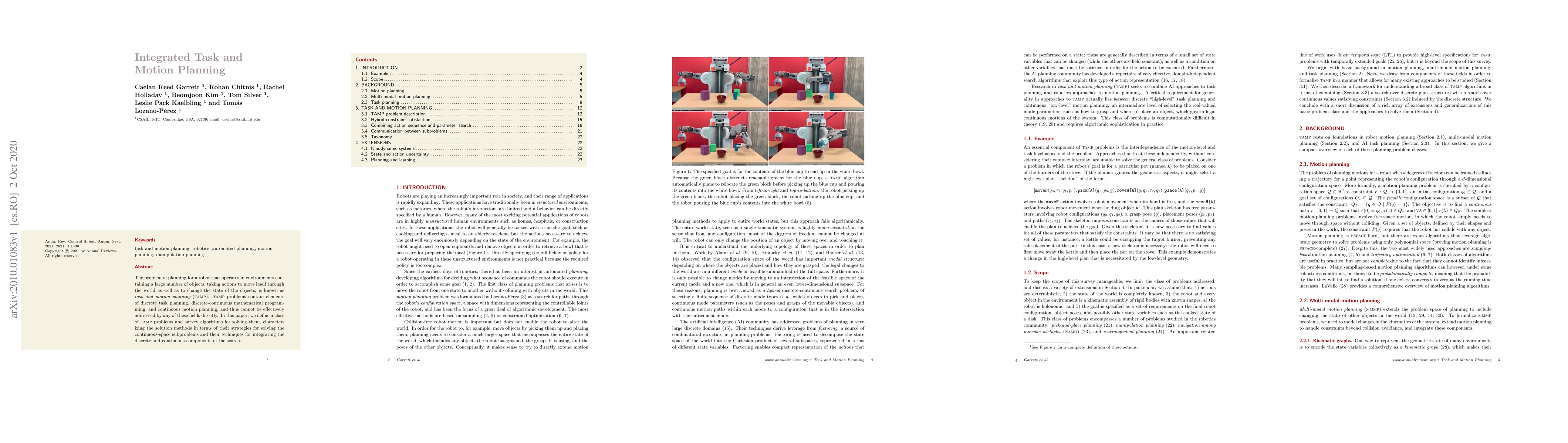 This paper defines a class of task and motion planning (TAMP) problems for robots operating in complex environments and surveys algorithms for solving them, focusing on strategies for continuous-space subproblems and integration techniques for discrete and continuous components.