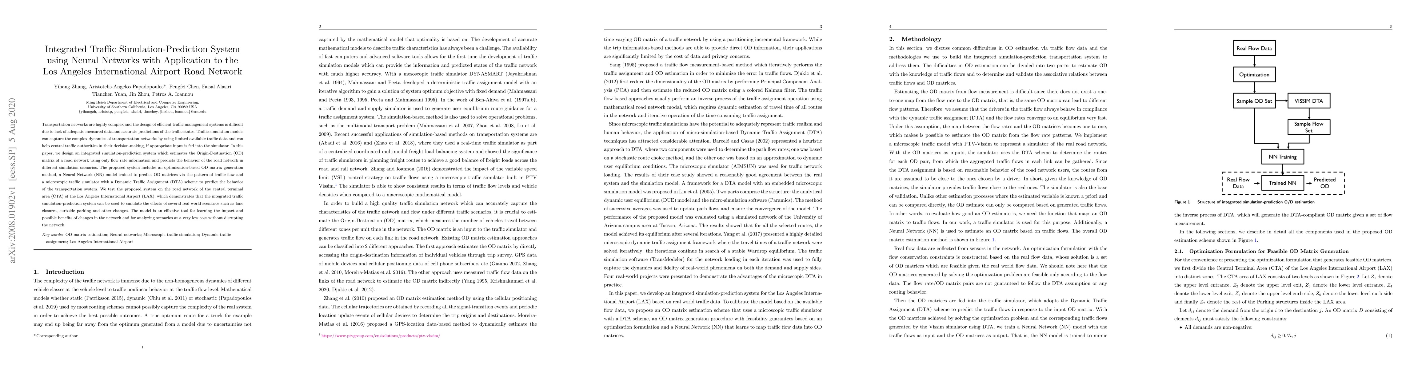 This paper presents an integrated traffic simulation-prediction system using neural networks to estimate the Origin-Destination (OD) matrix and predict road network behavior based on flow rate data. The system, tested on the Los Angeles International Airport road network, demonstrates its effectiveness in simulating real-world scenarios without network disruption.