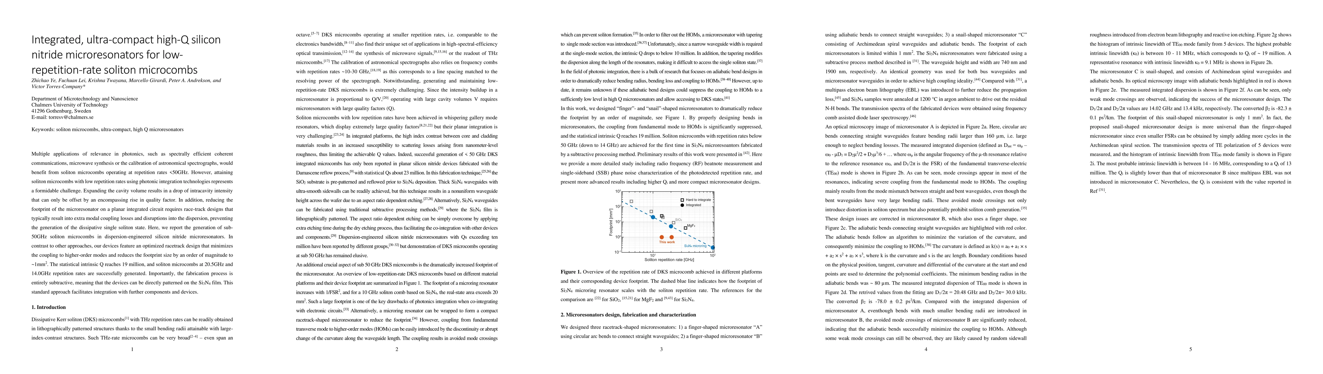 This paper presents ultra-compact silicon nitride microresonators that generate low-repetition-rate soliton microcombs (<50GHz), overcoming challenges of intensity drop and modal coupling losses. The optimized racetrack design enables successful generation of soliton microcombs at 20.5GHz and 14.0GHz, with a high intrinsic Q of 19 million.