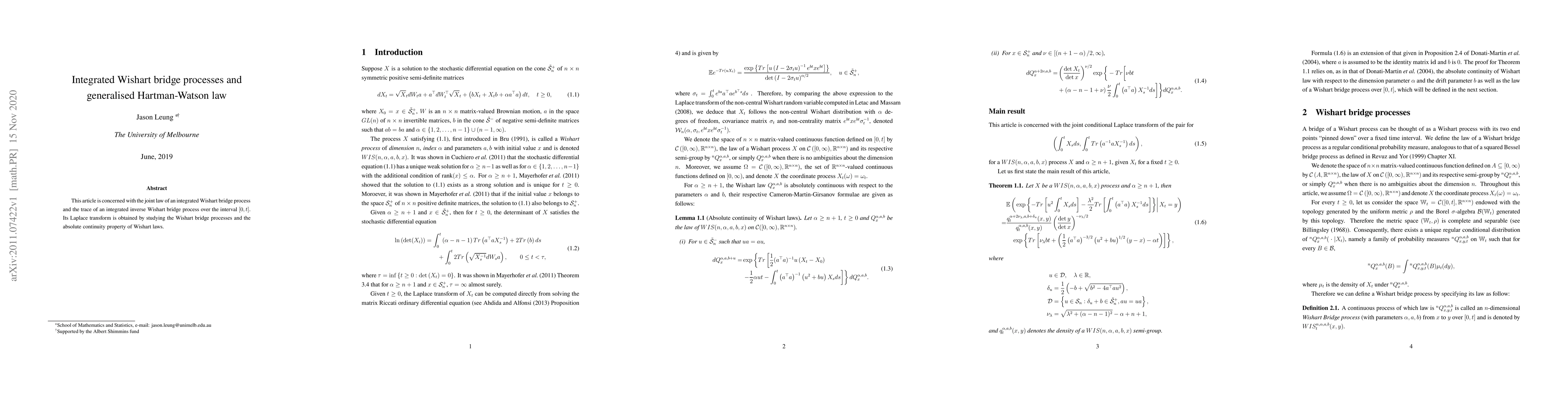 This paper investigates the joint law of an integrated Wishart bridge process and its relation to an integrated inverse Wishart bridge process, using Laplace transforms and studying absolute continuity properties of Wishart laws to obtain key findings.