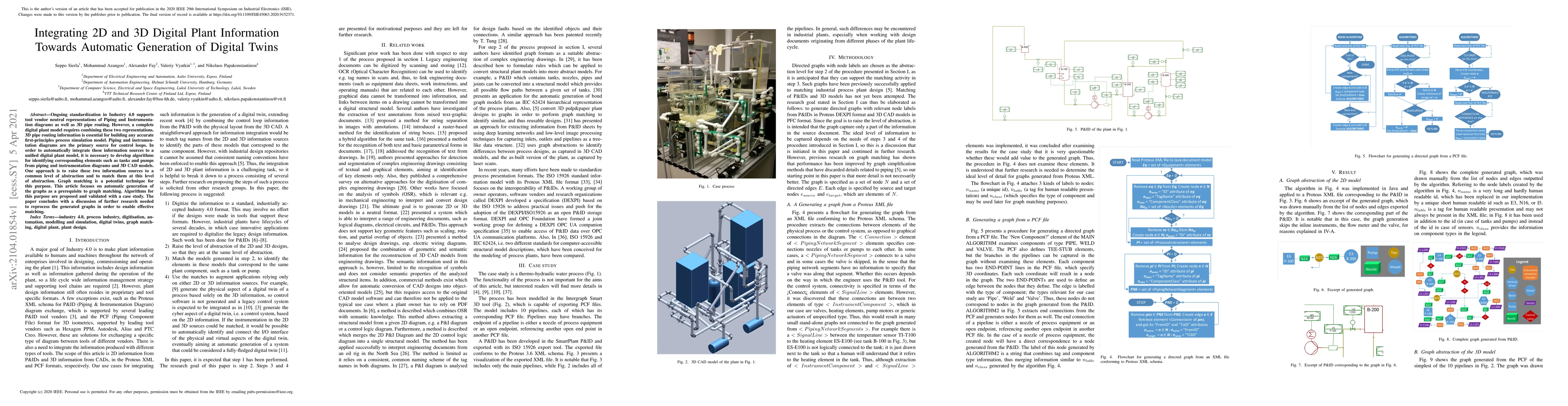 Ongoing standardization in Industry 4.0 supports tool vendor neutral representations of Piping and Instrumentation diagrams as well as 3D pipe routing. However, a complete digital plant model requires combining these two representations. 3D pipe routing information is essential for building any accurate first-principles process simulation model. Piping and instrumentation diagrams are the primary source for control loops. In order to automatically integrate these information sources to a unified digital plant model, it is necessary to develop algorithms for identifying corresponding elements such as tanks and pumps from piping and instrumentation diagrams and 3D CAD models. One approach is to raise these two information sources to a common level of abstraction and to match them at this level of abstraction. Graph matching is a potential technique for this purpose. This article focuses on automatic generation of the graphs as a prerequisite to graph matching. Algorithms for this purpose are proposed and validated with a case study. The paper concludes with a discussion of further research needed to reprocess the generated graphs in order to enable effective matching.