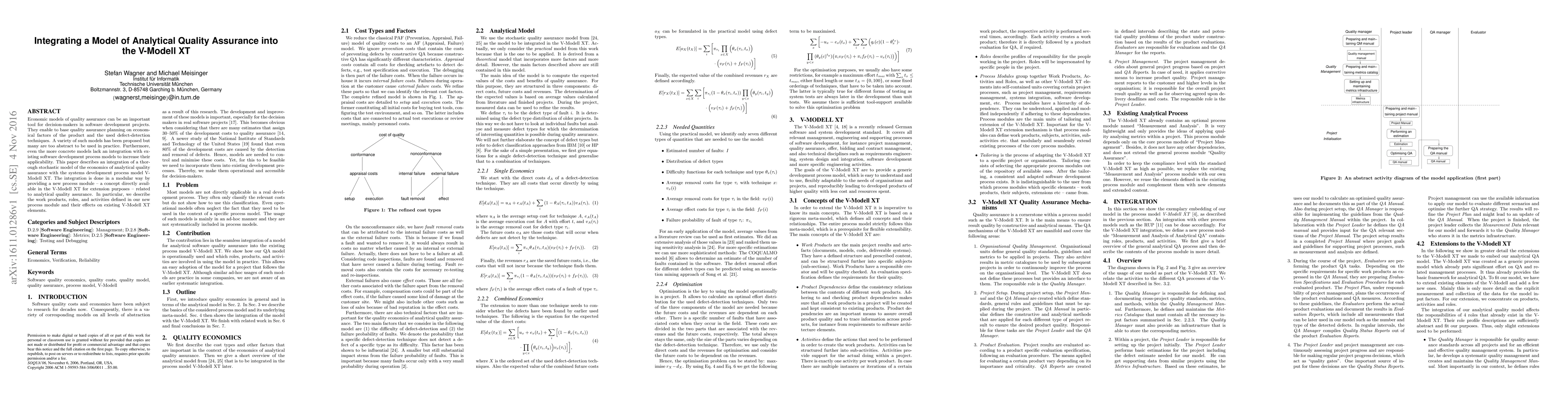 This paper integrates a detailed stochastic model of analytical quality assurance economics into the V-Modell XT, a systems development process model, by adding a new modular process module. The module outlines specific work products, roles, and activities to enhance the model's practical application in software development projects.