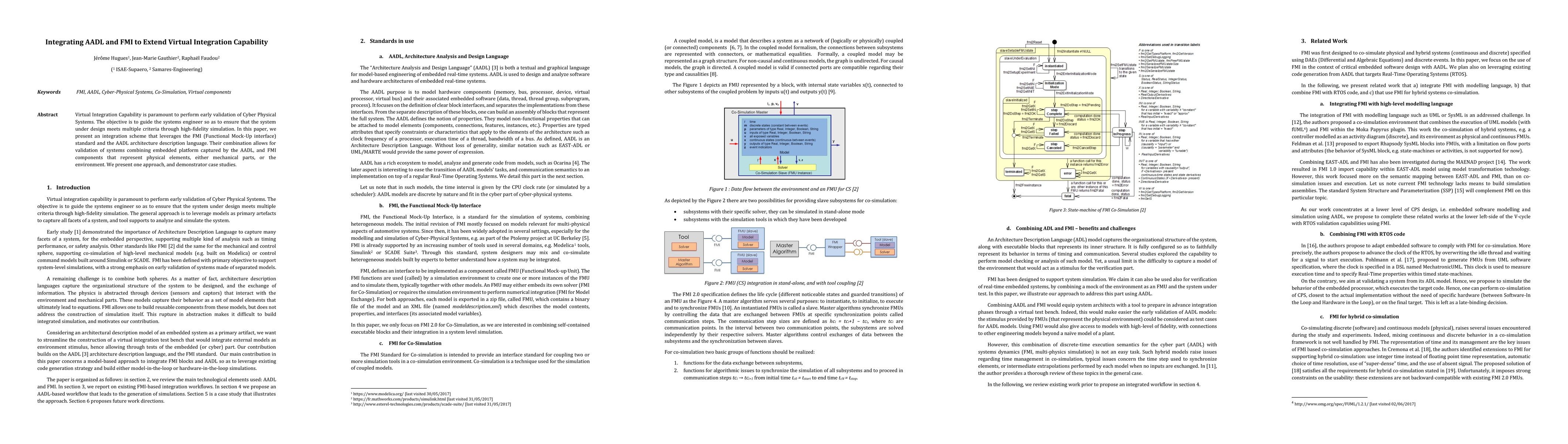 Virtual Integration Capability is paramount to perform early validation of Cyber Physical Systems. The objective is to guide the systems engineer so as to ensure that the system under design meets multiple criteria through high-fidelity simulation. In this paper, we present an integration scheme that leverages the FMI (Functional Mock-Up interface) standard and the AADL architecture description language. Their combination allows for validation of systems combining embedded platform captured by the AADL, and FMI components that represent physical elements, either mechanical parts, or the environment. We present one approach, and demonstrator case studies.