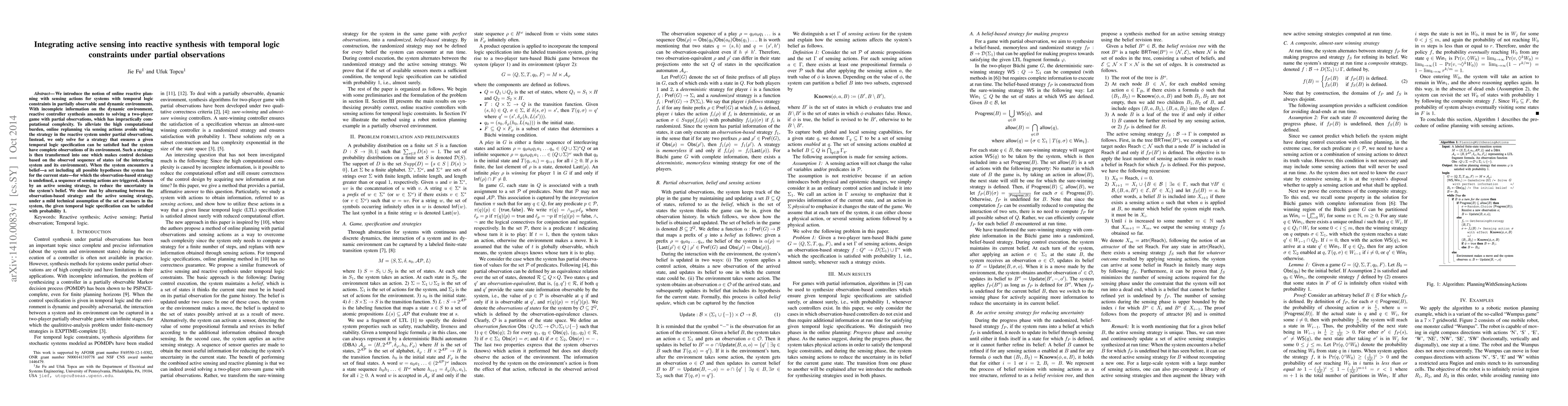 This paper proposes an online reactive planning method integrating active sensing to address temporal logic constraints in partially observable environments. By alternating between observation-based strategies and active sensing actions, the method ensures satisfaction of temporal logic specifications with high probability, mitigating computational complexity.