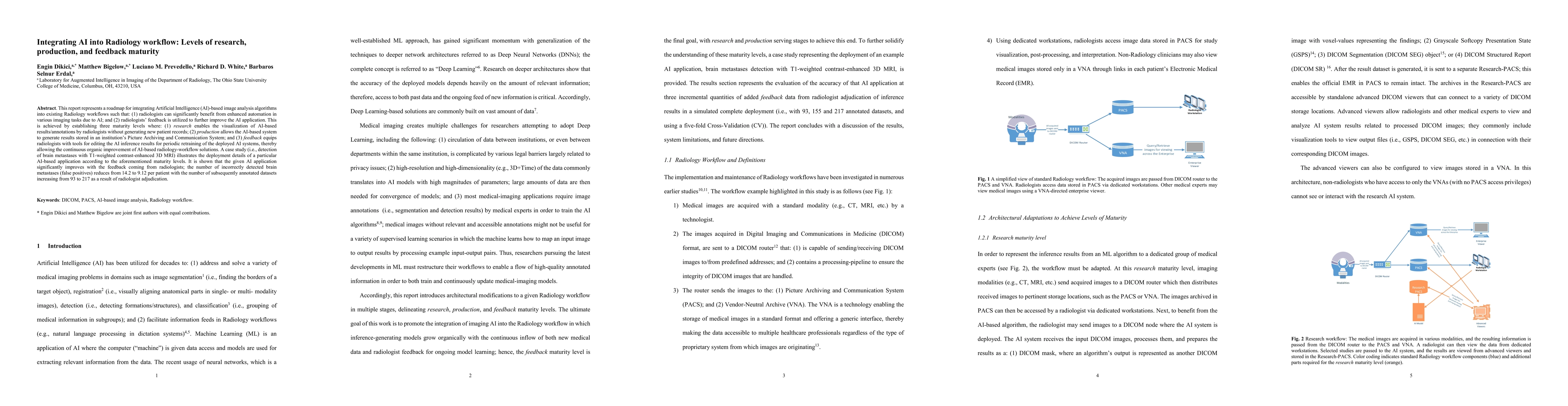 This report represents a roadmap for integrating Artificial Intelligence (AI)-based image analysis algorithms into existing Radiology workflows such that: (1) radiologists can significantly benefit from enhanced automation in various imaging tasks due to AI; and (2) radiologists' feedback is utilized to further improve the AI application. This is achieved by establishing three maturity levels where: (1) research enables the visualization of AI-based results/annotations by radiologists without generating new patient records; (2) production allows the AI-based system to generate results stored in an institution's Picture Archiving and Communication System; and (3) feedback equips radiologists with tools for editing the AI inference results for periodic retraining of the deployed AI systems, thereby allowing the continuous organic improvement of AI-based radiology-workflow solutions. A case study (i.e., detection of brain metastases with T1-weighted contrast-enhanced 3D MRI) illustrates the deployment details of a particular AI-based application according to the aforementioned maturity levels. It is shown that the given AI application significantly improves with the feedback coming from radiologists; the number of incorrectly detected brain metastases (false positives) reduces from 14.2 to 9.12 per patient with the number of subsequently annotated datasets increasing from 93 to 217 as a result of radiologist adjudication.
