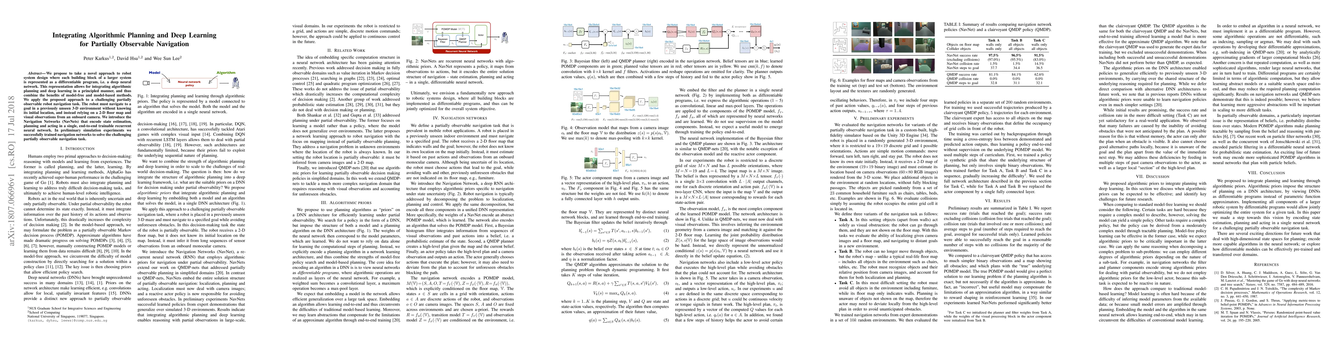 We propose to take a novel approach to robot system design where each building block of a larger system is represented as a differentiable program, i.e. a deep neural network. This representation allows for integrating algorithmic planning and deep learning in a principled manner, and thus combine the benefits of model-free and model-based methods. We apply the proposed approach to a challenging partially observable robot navigation task. The robot must navigate to a goal in a previously unseen 3-D environment without knowing its initial location, and instead relying on a 2-D floor map and visual observations from an onboard camera. We introduce the Navigation Networks (NavNets) that encode state estimation, planning and acting in a single, end-to-end trainable recurrent neural network. In preliminary simulation experiments we successfully trained navigation networks to solve the challenging partially observable navigation task.