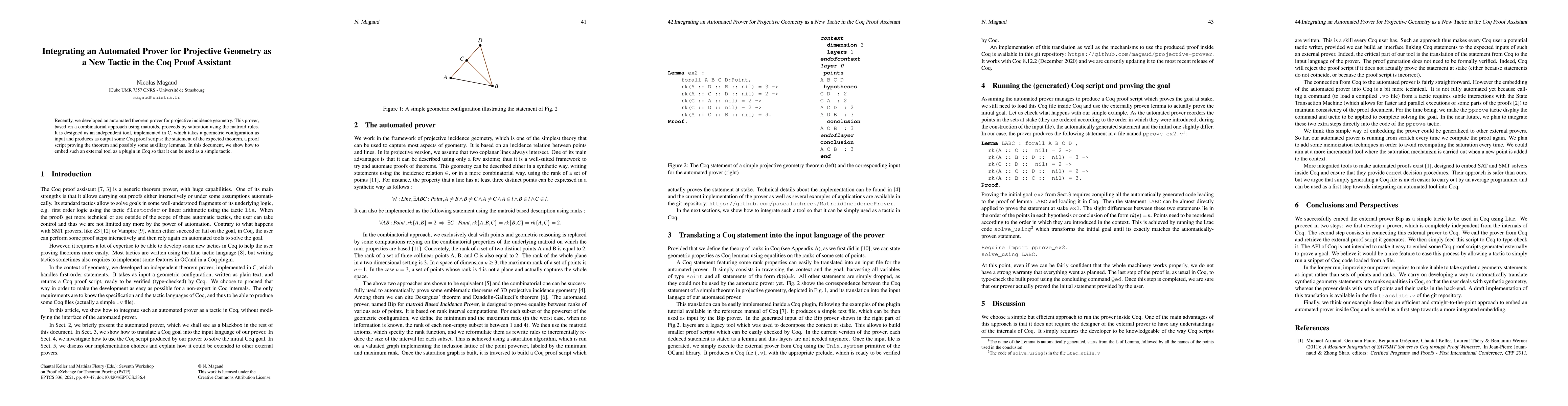 This paper presents an automated theorem prover for projective geometry implemented in C and describes its integration as a tactic within the Coq proof assistant, enabling users to leverage combinatorial matroid rules for proving geometric theorems directly within Coq.