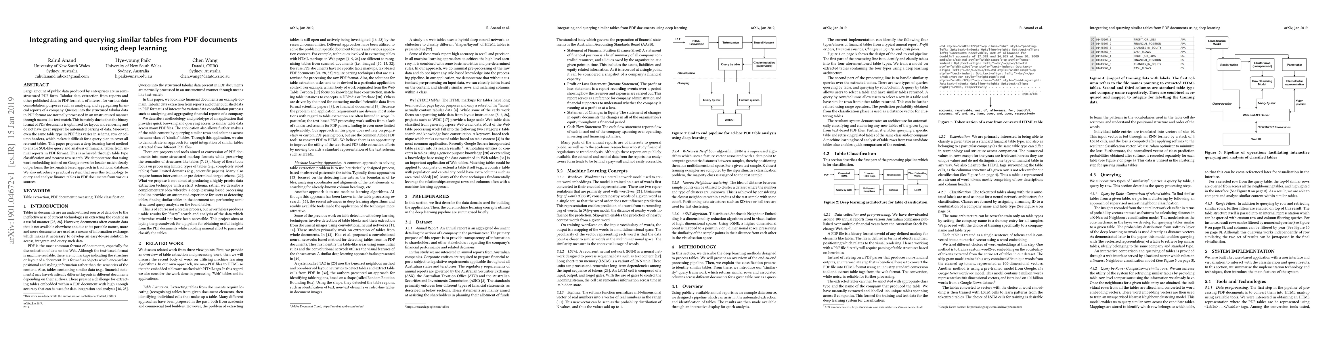 This paper proposes a deep learning method for extracting and querying tabular data from semi-structured PDF documents, enabling SQL-like analysis. The approach uses word embeddings for improved header matching and a system for querying financial tables, outperforming traditional text-match methods.