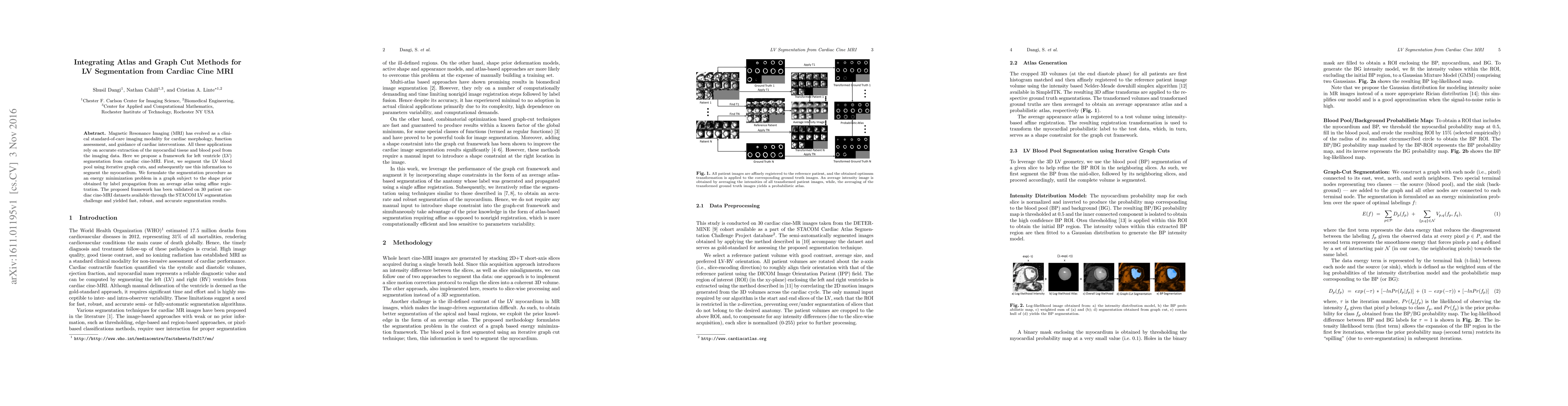 This paper proposes a framework for left ventricle segmentation from cardiac cine MRI using iterative graph cuts for the blood pool and an energy minimization approach incorporating atlas information for the myocardium. The method was validated on 30 patient datasets, demonstrating fast, robust, and accurate results.