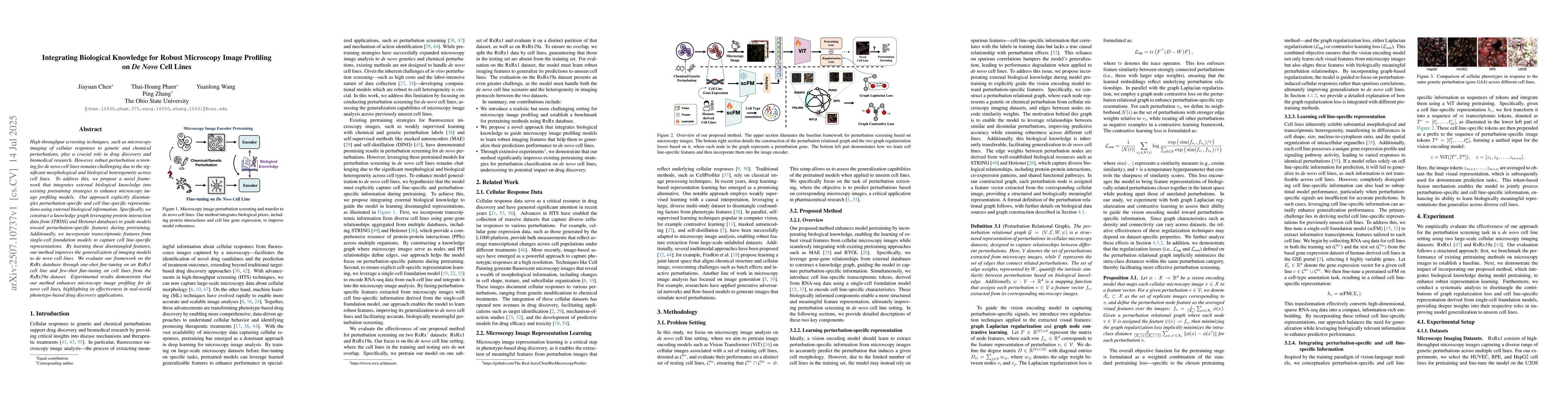 High-throughput screening techniques, such as microscopy imaging of cellular responses to genetic and chemical perturbations, play a crucial role in drug discovery and biomedical research. However, robust perturbation screening for \textit{de novo} cell lines remains challenging due to the significant morphological and biological heterogeneity across cell lines. To address this, we propose a novel framework that integrates external biological knowledge into existing pretraining strategies to enhance microscopy image profiling models. Our approach explicitly disentangles perturbation-specific and cell line-specific representations using external biological information. Specifically, we construct a knowledge graph leveraging protein interaction data from STRING and Hetionet databases to guide models toward perturbation-specific features during pretraining. Additionally, we incorporate transcriptomic features from single-cell foundation models to capture cell line-specific representations. By learning these disentangled features, our method improves the generalization of imaging models to \textit{de novo} cell lines. We evaluate our framework on the RxRx database through one-shot fine-tuning on an RxRx1 cell line and few-shot fine-tuning on cell lines from the RxRx19a dataset. Experimental results demonstrate that our method enhances microscopy image profiling for \textit{de novo} cell lines, highlighting its effectiveness in real-world phenotype-based drug discovery applications.