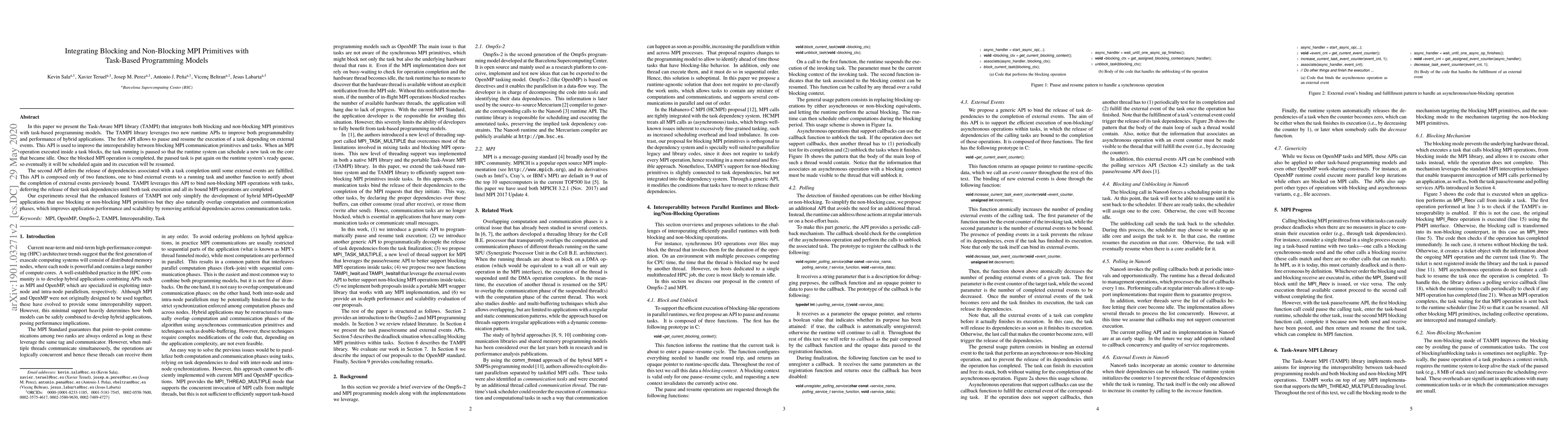 The TAMPI library integrates blocking and non-blocking MPI primitives with task-based programming models, improving hybrid application performance and scalability.