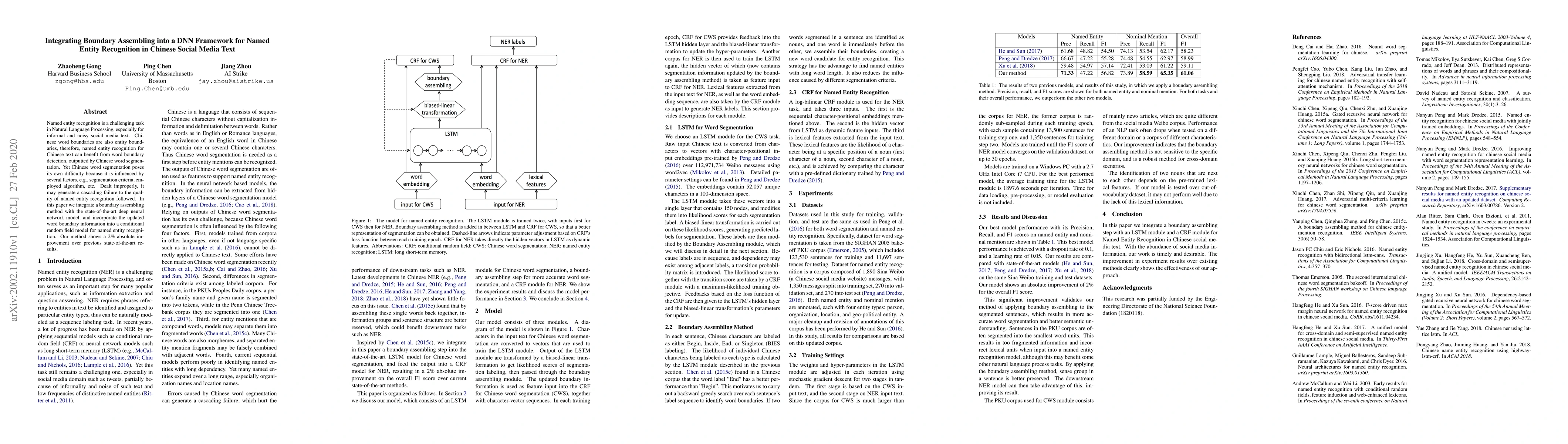 Named entity recognition is a challenging task in Natural Language Processing, especially for informal and noisy social media text. Chinese word boundaries are also entity boundaries, therefore, named entity recognition for Chinese text can benefit from word boundary detection, outputted by Chinese word segmentation. Yet Chinese word segmentation poses its own difficulty because it is influenced by several factors, e.g., segmentation criteria, employed algorithm, etc. Dealt improperly, it may generate a cascading failure to the quality of named entity recognition followed. In this paper we integrate a boundary assembling method with the state-of-the-art deep neural network model, and incorporate the updated word boundary information into a conditional random field model for named entity recognition. Our method shows a 2% absolute improvement over previous state-of-the-art results.