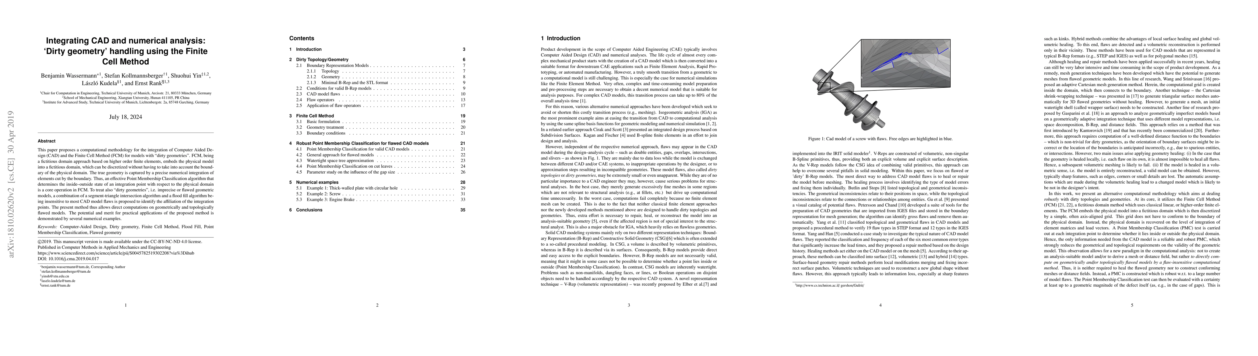 This paper introduces a computational methodology integrating CAD and the Finite Cell Method (FCM) to handle "dirty geometries" by embedding physical models into a fictitious domain, allowing precise numerical integration of cut elements. The proposed segment-triangle intersection and flood fill algorithms enable effective computation on flawed CAD models.
