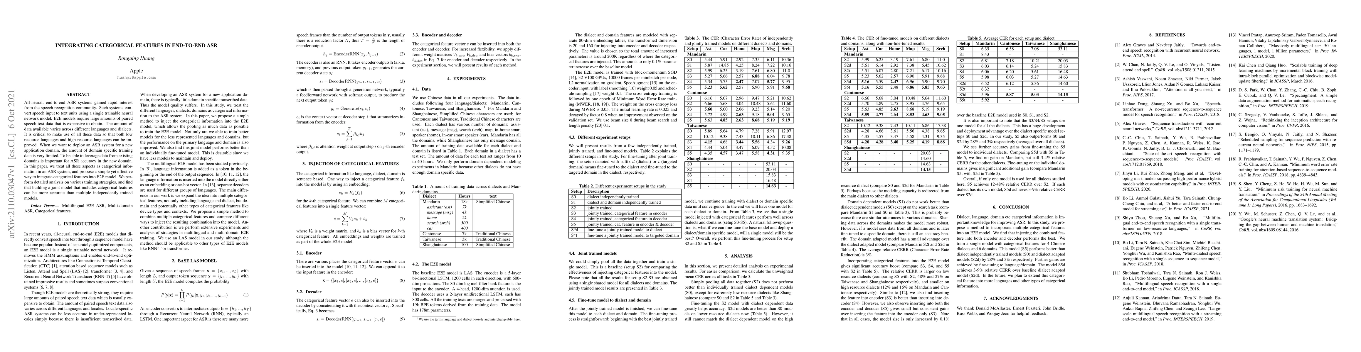 This paper proposes a method to integrate categorical features into end-to-end ASR models to improve accuracy, especially for low-resource languages and new application domains. The study finds that a joint model incorporating categorical information outperforms multiple independently trained models.