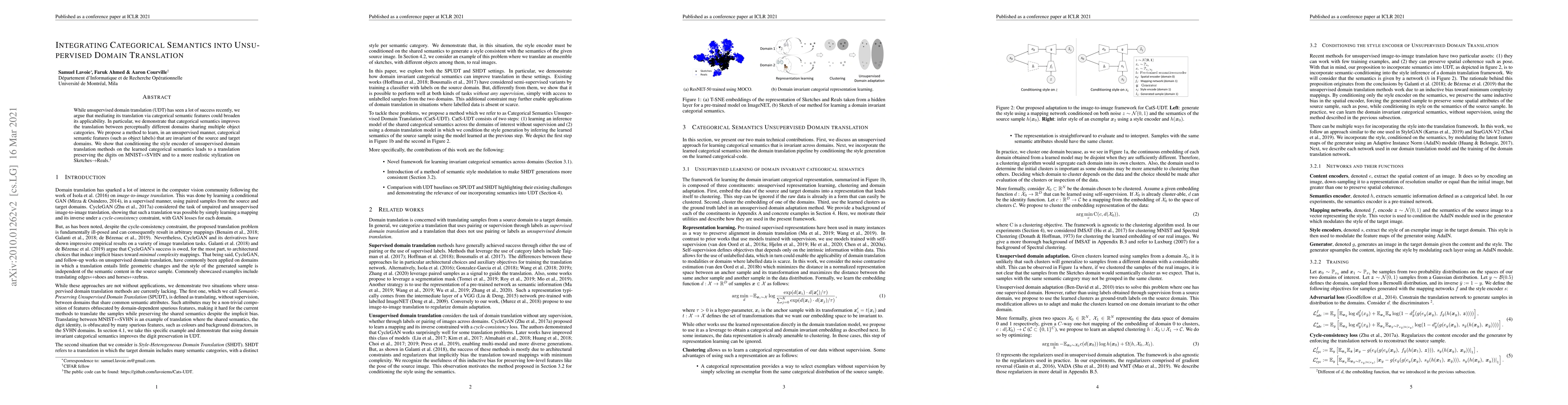 This paper proposes integrating categorical semantics into unsupervised domain translation to enhance translation between perceptually different domains. The method learns invariant categorical semantic features in an unsupervised manner, improving translation quality and stylization by conditioning the style encoder on these features.