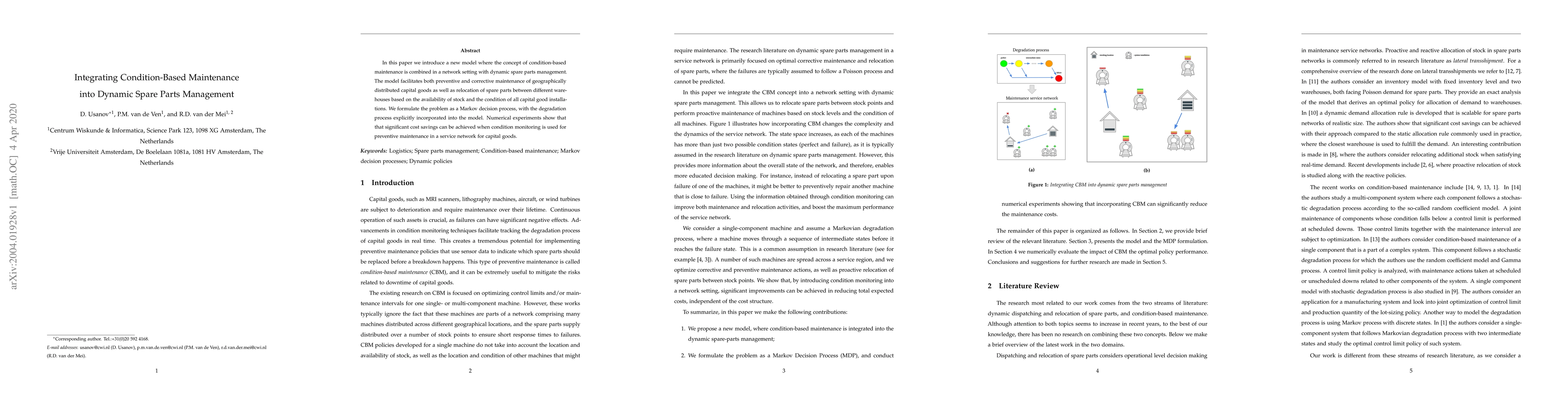 The paper presents a Markov decision process formulation for integrating condition-based maintenance with dynamic spare parts management, explicitly incorporating machine degradation processes.