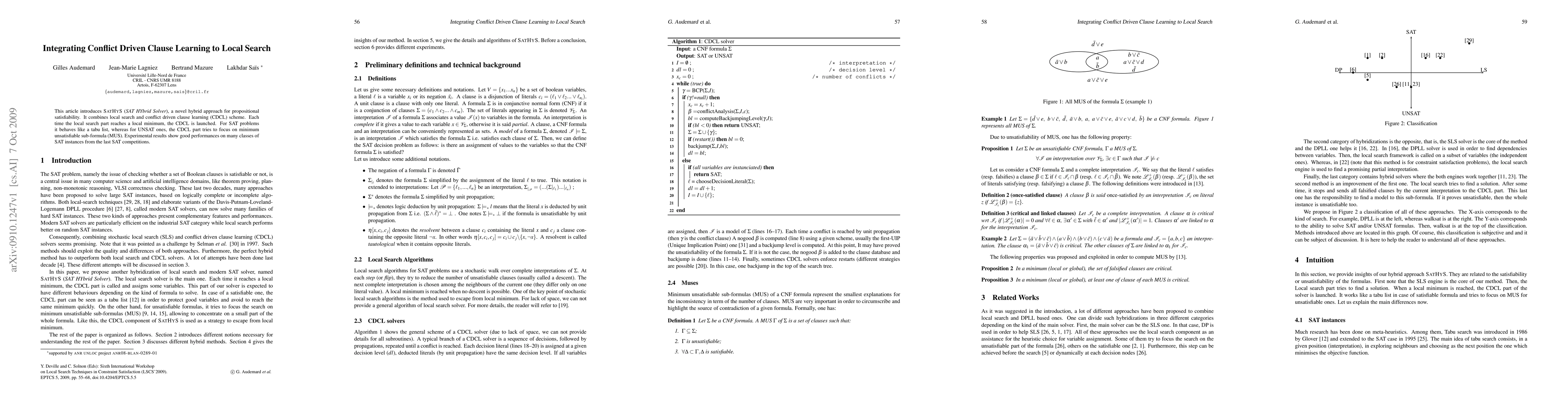 A new hybrid approach combines local search with conflict-driven clause learning to improve performance on SAT problems. Experimental results show good performances on many classes of SAT instances from recent competitions.