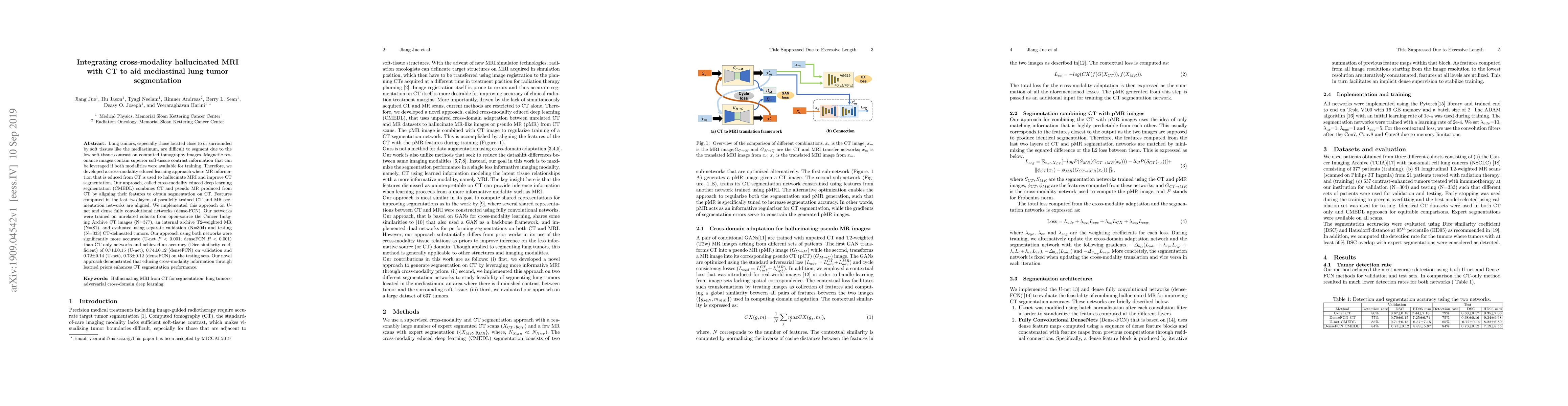 This paper proposes a cross-modality educed deep learning segmentation (CMEDL) approach to enhance CT segmentation of mediastinal lung tumors by hallucinating MRI from CT data. The method significantly improves segmentation accuracy compared to CT-only networks, achieving a Dice similarity coefficient of 0.71-0.74.