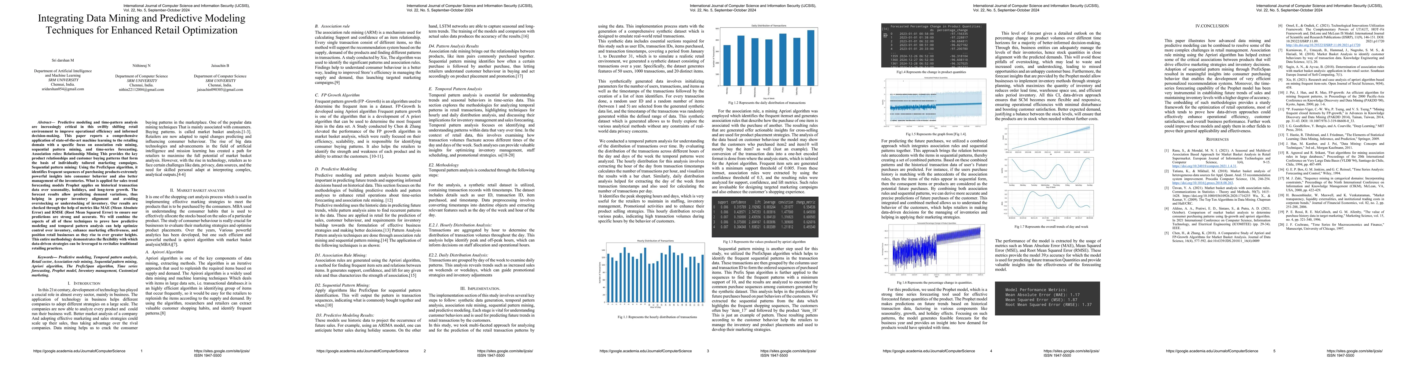 Predictive modeling and time-pattern analysis are increasingly critical in this swiftly shifting retail environment to improve operational efficiency and informed decision-making. This paper reports a comprehensive application of state-of-the-art machine learning to the retailing domain with a specific focus on association rule mining, sequential pattern mining, and time-series forecasting. Association rules: Relationship Mining This provides the key product relationships and customer buying patterns that form the basis of individually tailored marketing campaigns. Sequential pattern mining: Using the PrefixSpan algorithm, it identifies frequent sequences of purchasing products-extremely powerful insights into consumer behavior and also better management of the inventories. What is applied for sales trend forecasting models Prophet applies on historical transaction data over seasonality, holidays, and long-term growth. The forecast results allow predicting demand variations, thus helping in proper inventory alignment and avoiding overstocking or understocking of inventory. Our results are checked through the help of metrics like MAE (Mean Absolute Error) and RMSE (Root Mean Squared Error) to ensure our predictions are strong and accurate. We will combine the aspects of all of these techniques to prove how predictive modeling and temporal pattern analysis can help optimize control over inventory, enhance marketing effectiveness, and position retail businesses as they rise to ever greater heights. This entire methodology demonstrates the flexibility with which data-driven strategies can be leveraged to revitalize traditional retailing practices.