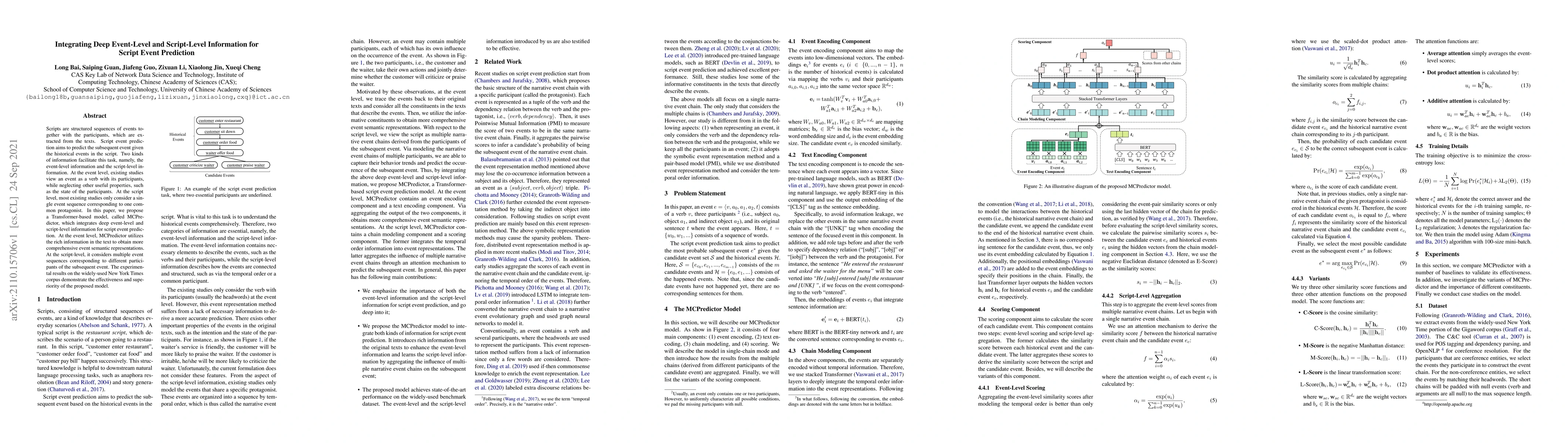 This paper proposes MCPredictor, a Transformer-based model that integrates deep event-level and script-level information for script event prediction, addressing limitations in existing models by considering comprehensive event semantics and multiple event sequences for different participants. Experimental results show its effectiveness on the New York Times corpus.