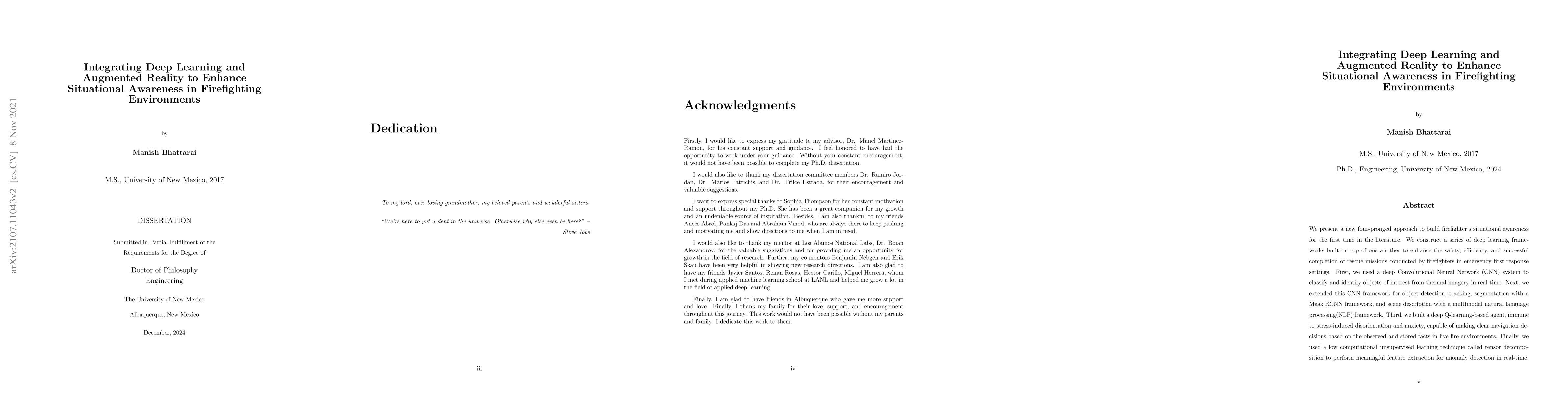 This paper proposes a four-part deep learning framework to enhance firefighters' situational awareness in emergency settings. It integrates CNNs for real-time object identification, Mask RCNN for detection and segmentation, deep Q-learning for navigation, and tensor decomposition for anomaly detection, all feeding into an augmented reality system to guide firefighters and improve mission success.
