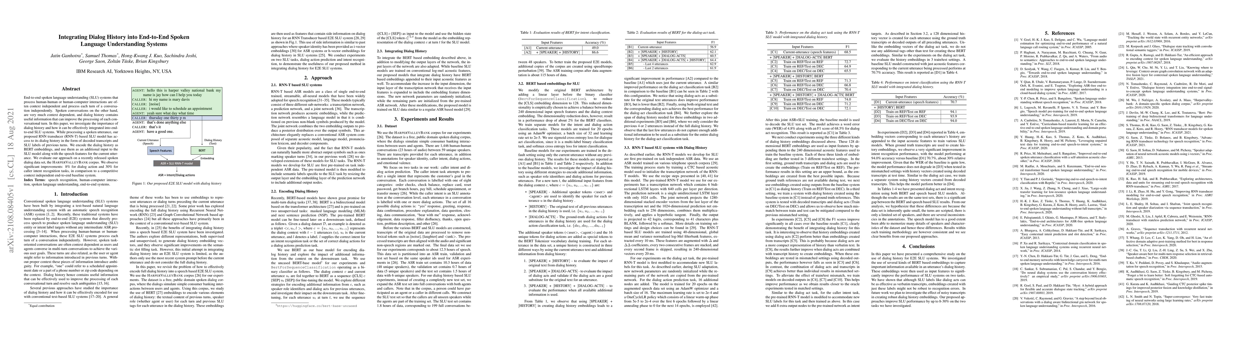 End-to-end spoken language understanding (SLU) systems that process human-human or human-computer interactions are often context independent and process each turn of a conversation independently. Spoken conversations on the other hand, are very much context dependent, and dialog history contains useful information that can improve the processing of each conversational turn. In this paper, we investigate the importance of dialog history and how it can be effectively integrated into end-to-end SLU systems. While processing a spoken utterance, our proposed RNN transducer (RNN-T) based SLU model has access to its dialog history in the form of decoded transcripts and SLU labels of previous turns. We encode the dialog history as BERT embeddings, and use them as an additional input to the SLU model along with the speech features for the current utterance. We evaluate our approach on a recently released spoken dialog data set, the HarperValleyBank corpus. We observe significant improvements: 8% for dialog action and 30% for caller intent recognition tasks, in comparison to a competitive context independent end-to-end baseline system.