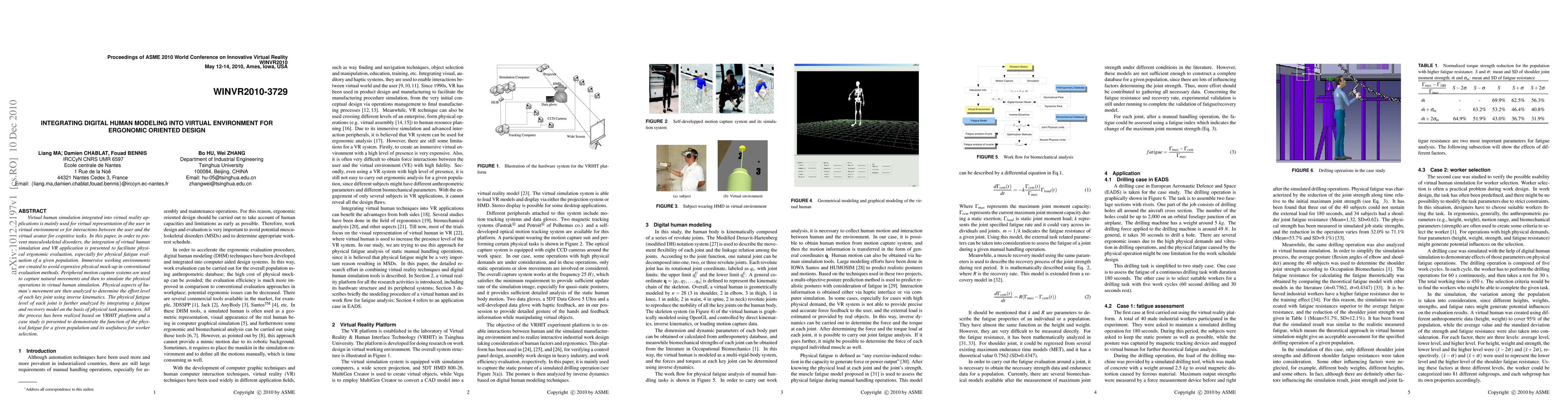Virtual human simulation integrated into virtual reality applications is mainly used for virtual representation of the user in virtual environment or for interactions between the user and the virtual avatar for cognitive tasks. In this paper, in order to prevent musculoskeletal disorders, the integration of virtual human simulation and VR application is presented to facilitate physical ergonomic evaluation, especially for physical fatigue evaluation of a given population. Immersive working environments are created to avoid expensive physical mock-up in conventional evaluation methods. Peripheral motion capture systems are used to capture natural movements and then to simulate the physical operations in virtual human simulation. Physical aspects of human's movement are then analyzed to determine the effort level of each key joint using inverse kinematics. The physical fatigue level of each joint is further analyzed by integrating a fatigue and recovery model on the basis of physical task parameters. All the process has been realized based on VRHIT platform and a case study is presented to demonstrate the function of the physical fatigue for a given population and its usefulness for worker selection.