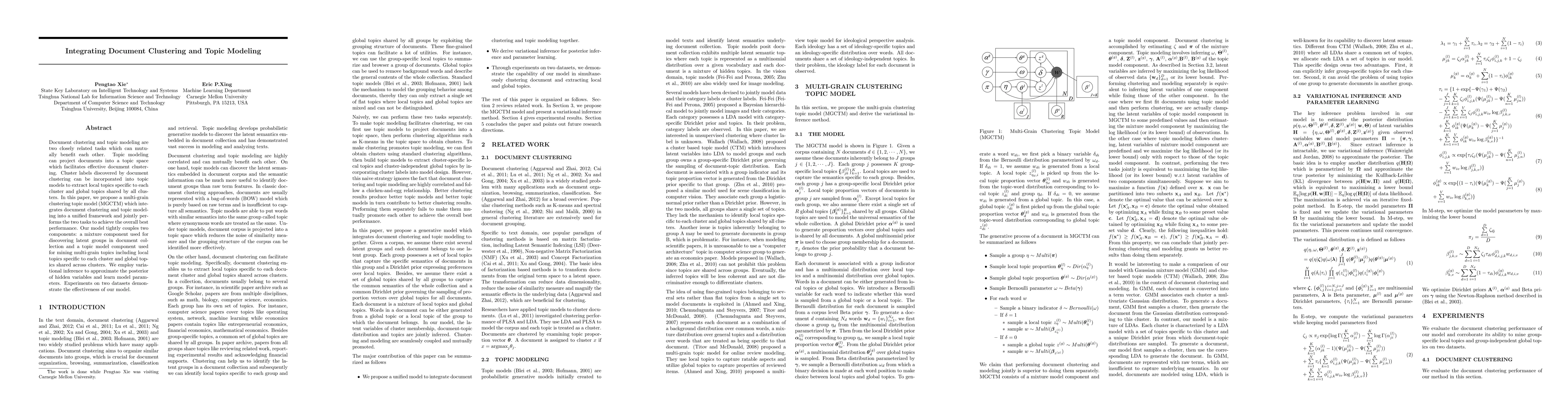 This paper proposes a multi-grain clustering topic model (MGCTM) that integrates document clustering and topic modeling to enhance both tasks. The MGCTM framework jointly performs clustering and topic modeling, leveraging cluster labels to refine topic extraction and vice versa, achieving superior performance.