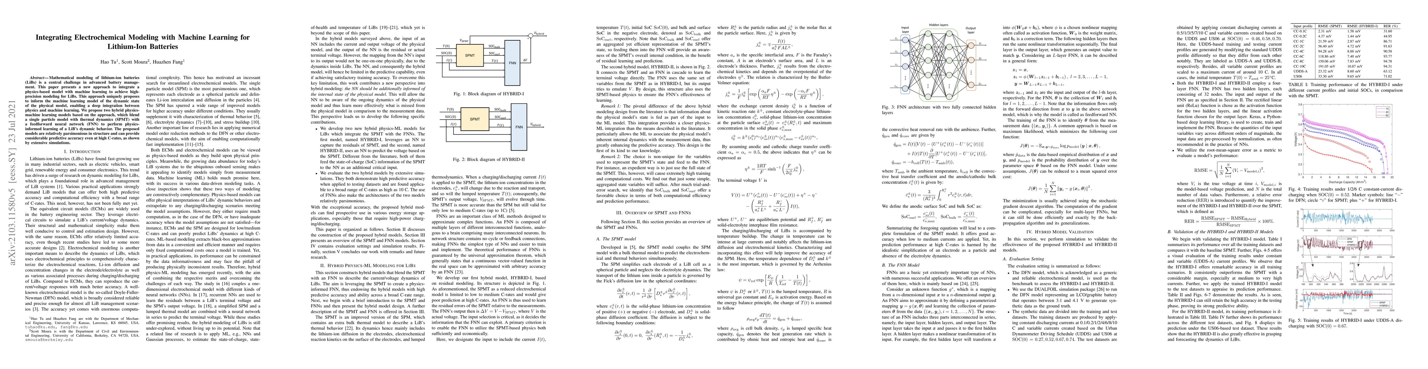 This paper introduces an innovative method to integrate electrochemical modeling with machine learning for lithium-ion batteries, combining a physics-based single particle model with thermal dynamics (SPMT) and a feedforward neural network (FNN) to achieve high-precision, predictive modeling, demonstrating significant accuracy even at high discharge rates through extensive simulations.
